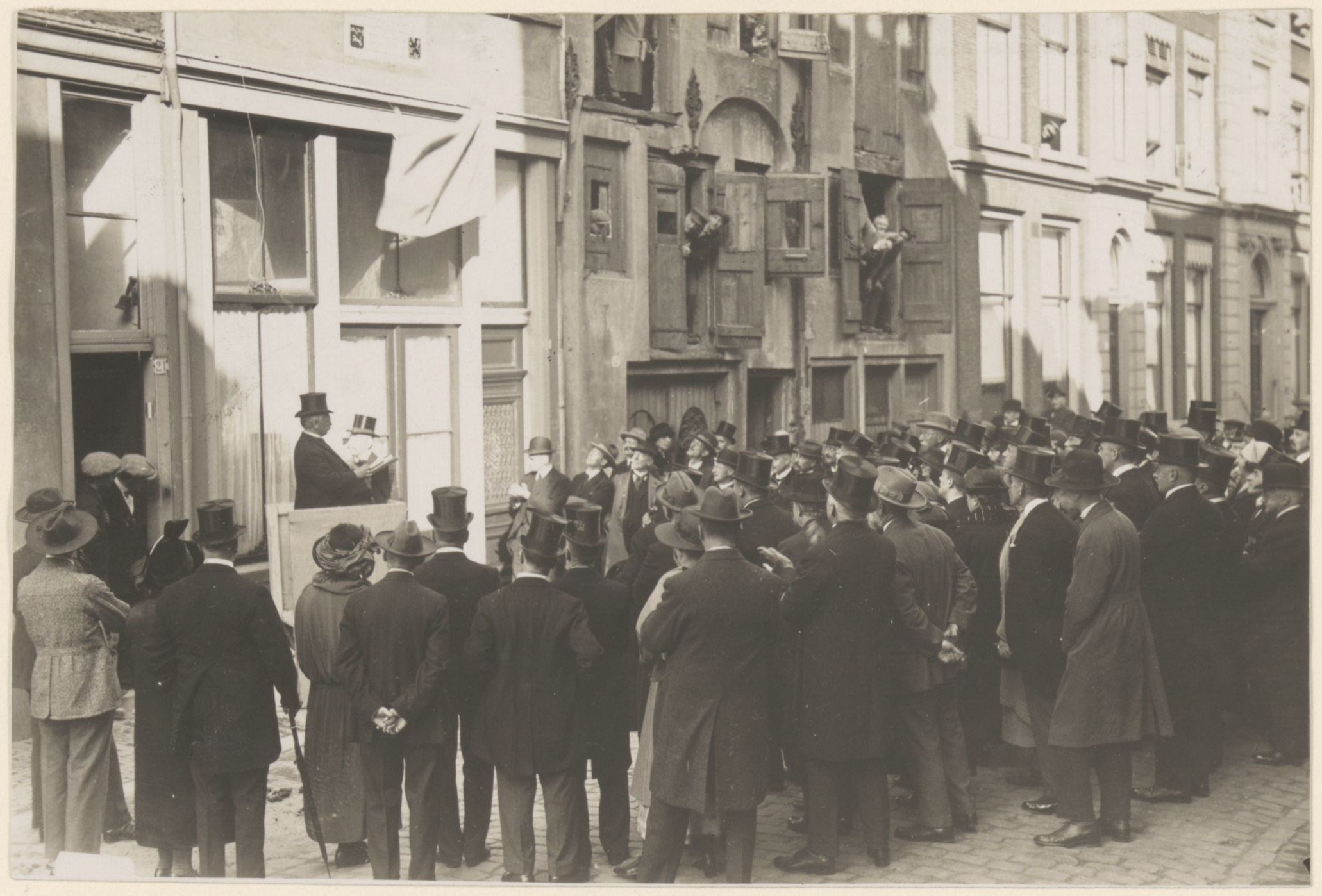 Onthulling van een gedenksteen door burgemeester de Gaay Fortman ter gelegenheid van de 300ste geboortedag van Johan de Witt. De steen - ontworpen door architect B. Bilderbeek - bevindt zich op het geboortehuis van De Witt: Grotekerksbuurt 19.