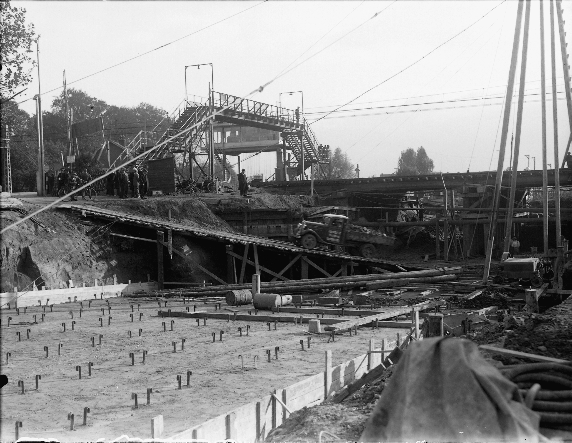 - Bouwwerkzaamheden aan de Krispijntunnel. Links ligt de spoorwegovergang die de Spuiweg met de Krispijnseweg verbindt. Ernaast de voetgangersbrug en het seinhuis. Naar het zuiden gezien.