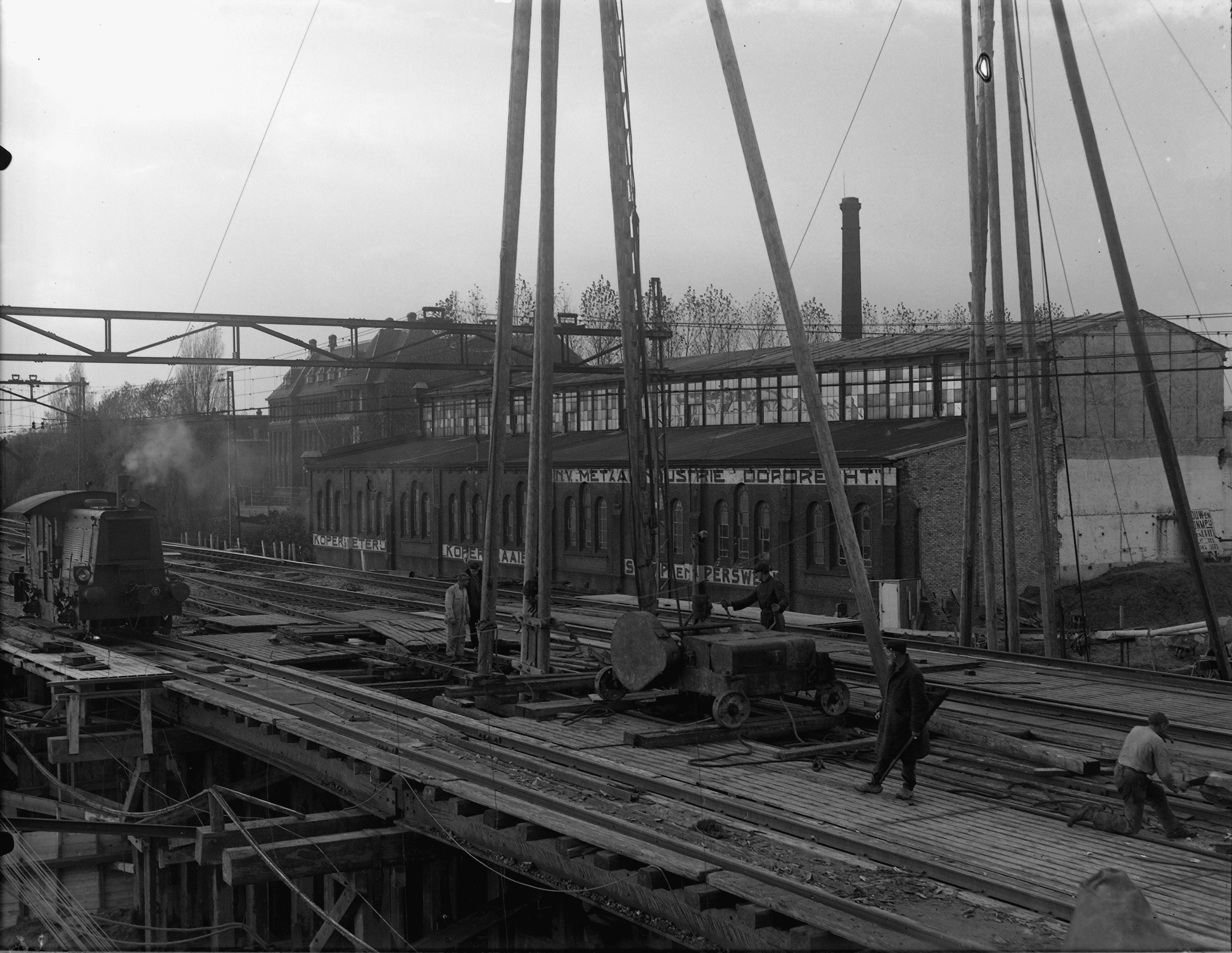 Spoorbaan naar Zwijndrecht bij de oude fabriek van Lips tijdens de bouw van de …