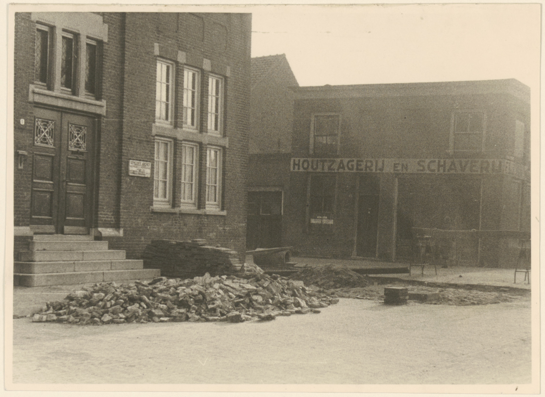 De aanleg van een nieuwe riolering voor de deur bij het Stadsarchief, Stek 1 (nu 13). Met Houtzagerij en Schaverij J. van Welsenes op de hoek van de Stekstraat en Schoolstraat.