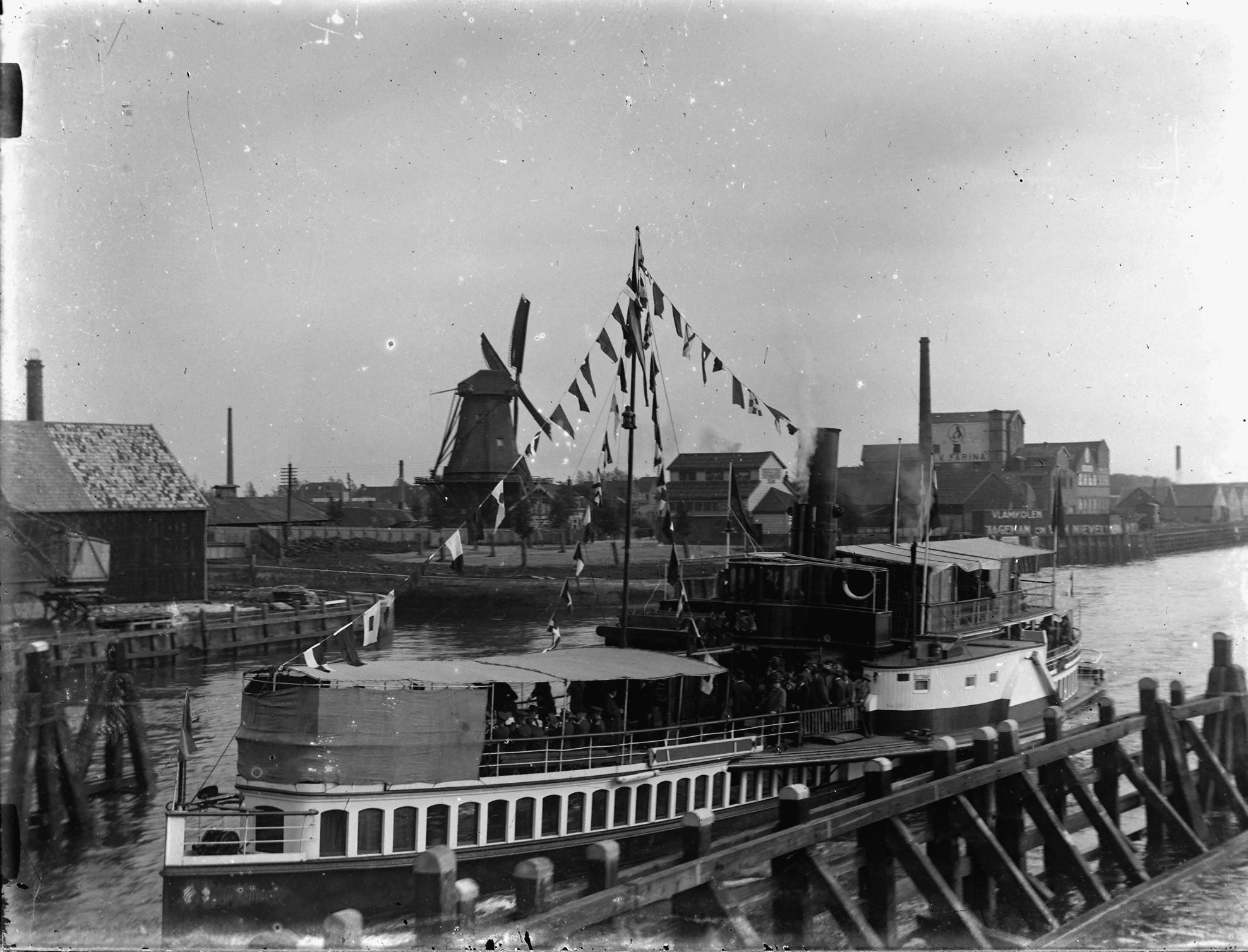 - Boot met gasten op de Oude Maas. Molen De Pelikaan op de hoek Weeskinderendijk/'s-Gravendeelsedijk, rechts meelfabriek Farina.