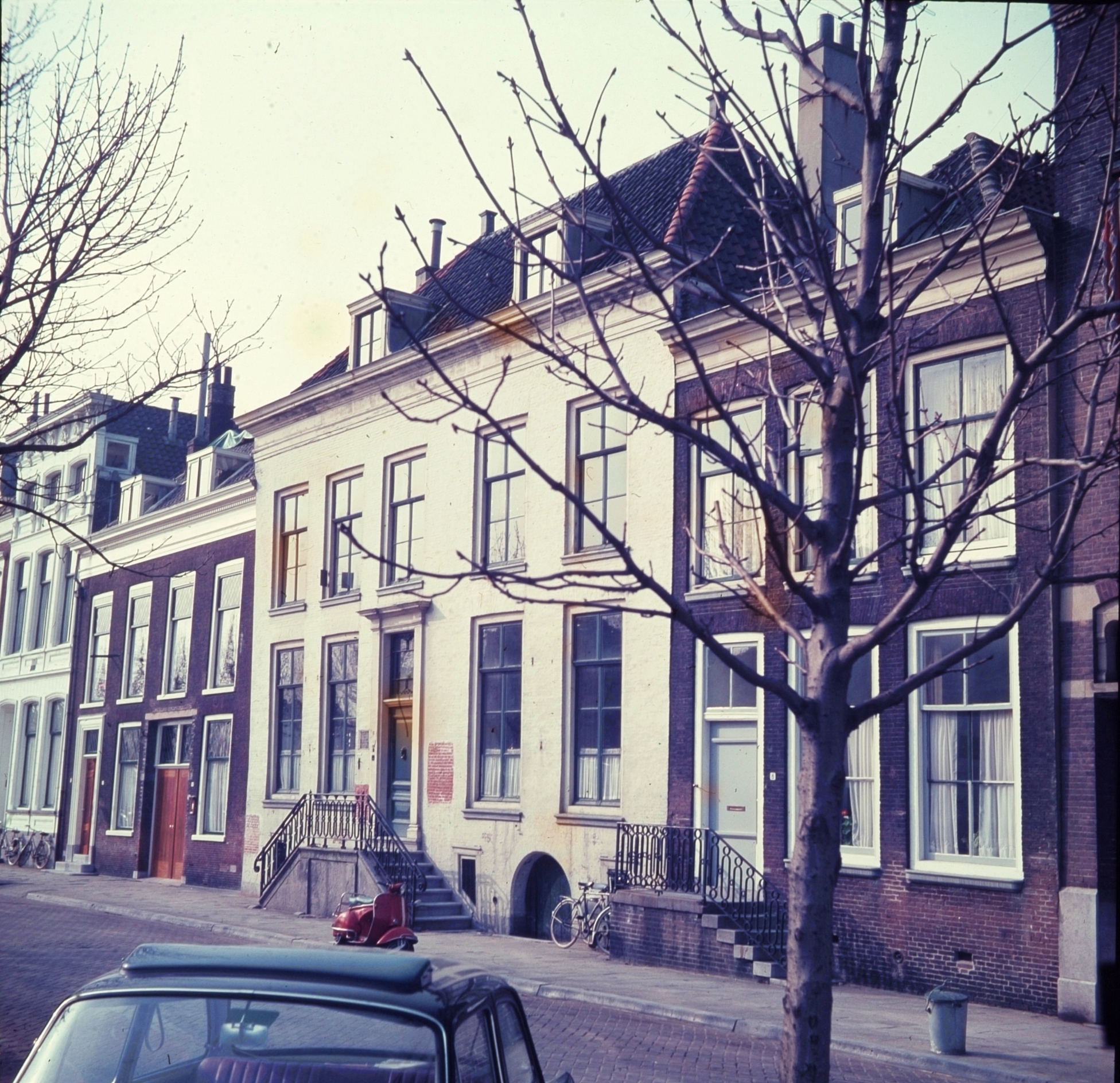 - Koopmanshuizen met trappen aan de voorzijde aan de Wolwevershaven, het grote middelste pand vóór de restauratie.