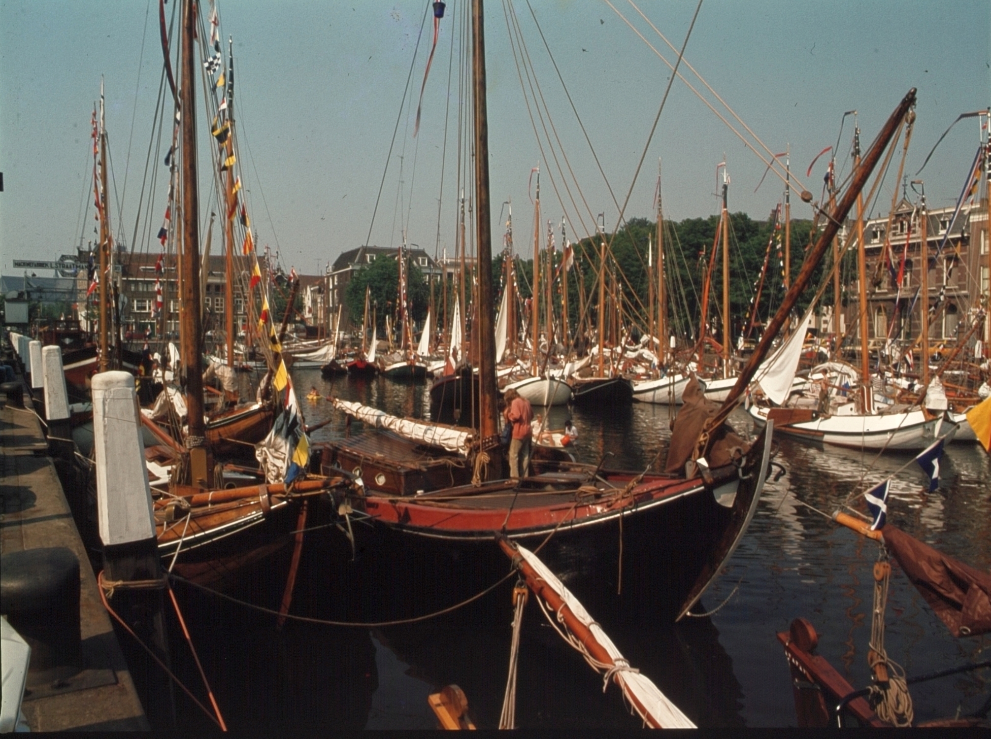- De Wolwevershaven vol met zeilboten (zalmschouwen); nog net te zien, links de kraan van Machinenfabriek Straatman, gezien in de richting van het Vlak.