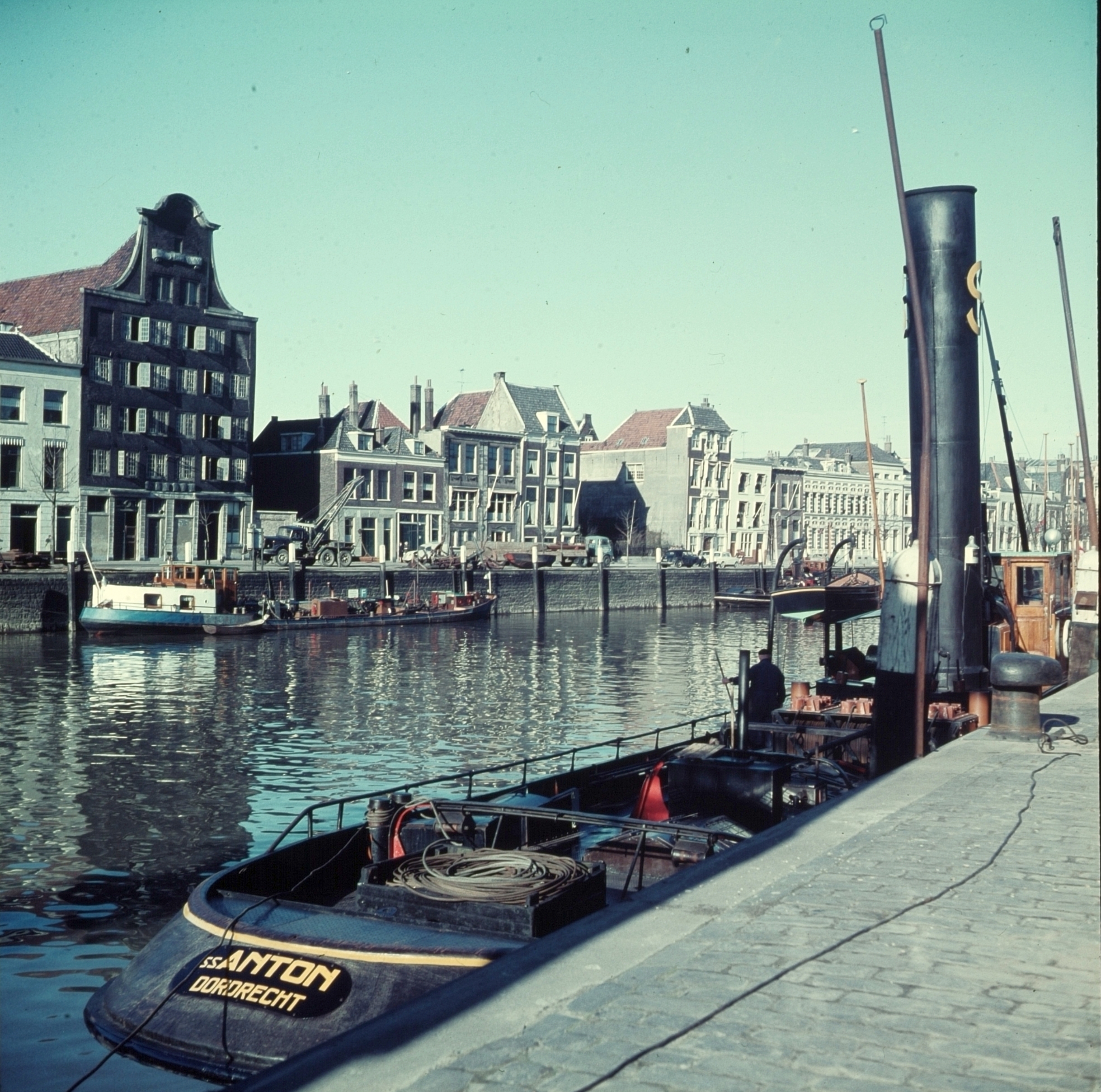 - Stoomsleepboot Anton uit Dordrecht gelegen aan de kade van de Kuipershaven, in de Wolwevershaven, aan de overkant het pand met het hoogste dak pakhuis Stokholm.