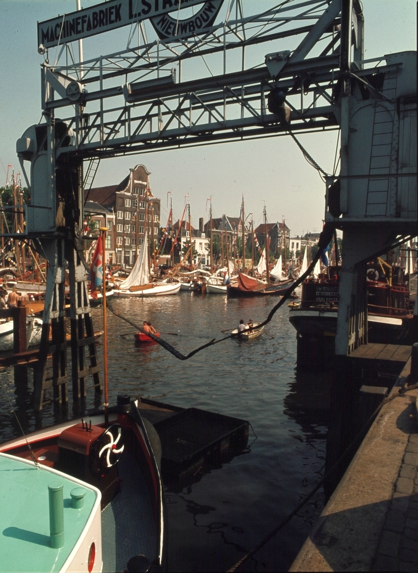 - De bootlift van de machinefabriek Straatman in de Wolwevershaven, aan de linker kant het pand met het hoogste dak is pakhuis Stokholm, verder ligt de haven vol met pleziervaart.