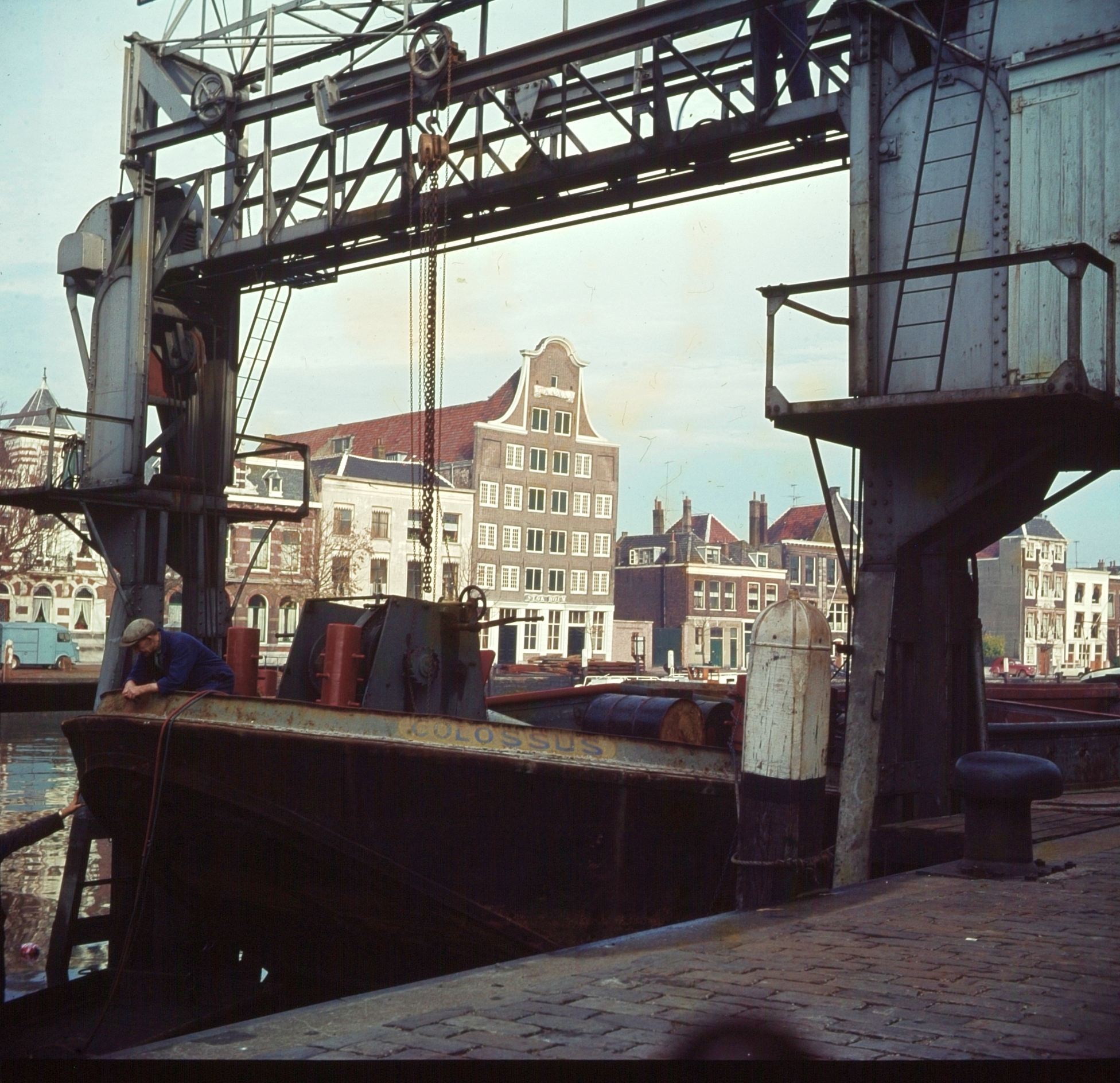 - Het vrachtschip Colossus in de bootlift van machinefabriek Straatman in de Wolwevershaven, op de achtergrond koopmanshuizen en met het hoogste dak pakhuis Stokholm.