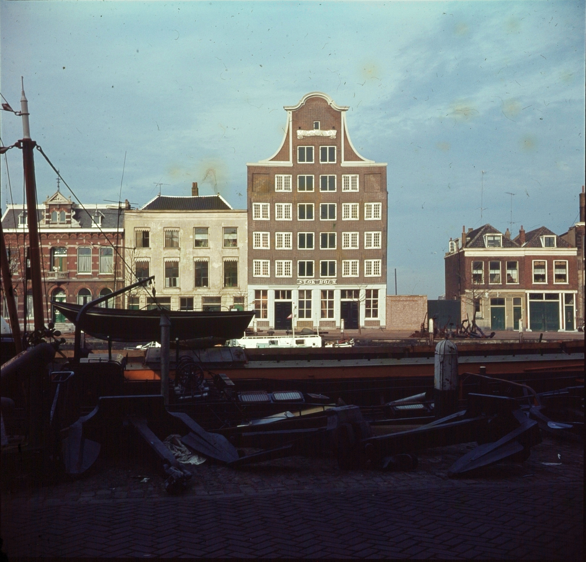 - Het pakhuis Stokholm aan de Wolwevershaven gezien vanaf de kade van de Kuipershaven, op de voorgrond vrachtschepen.