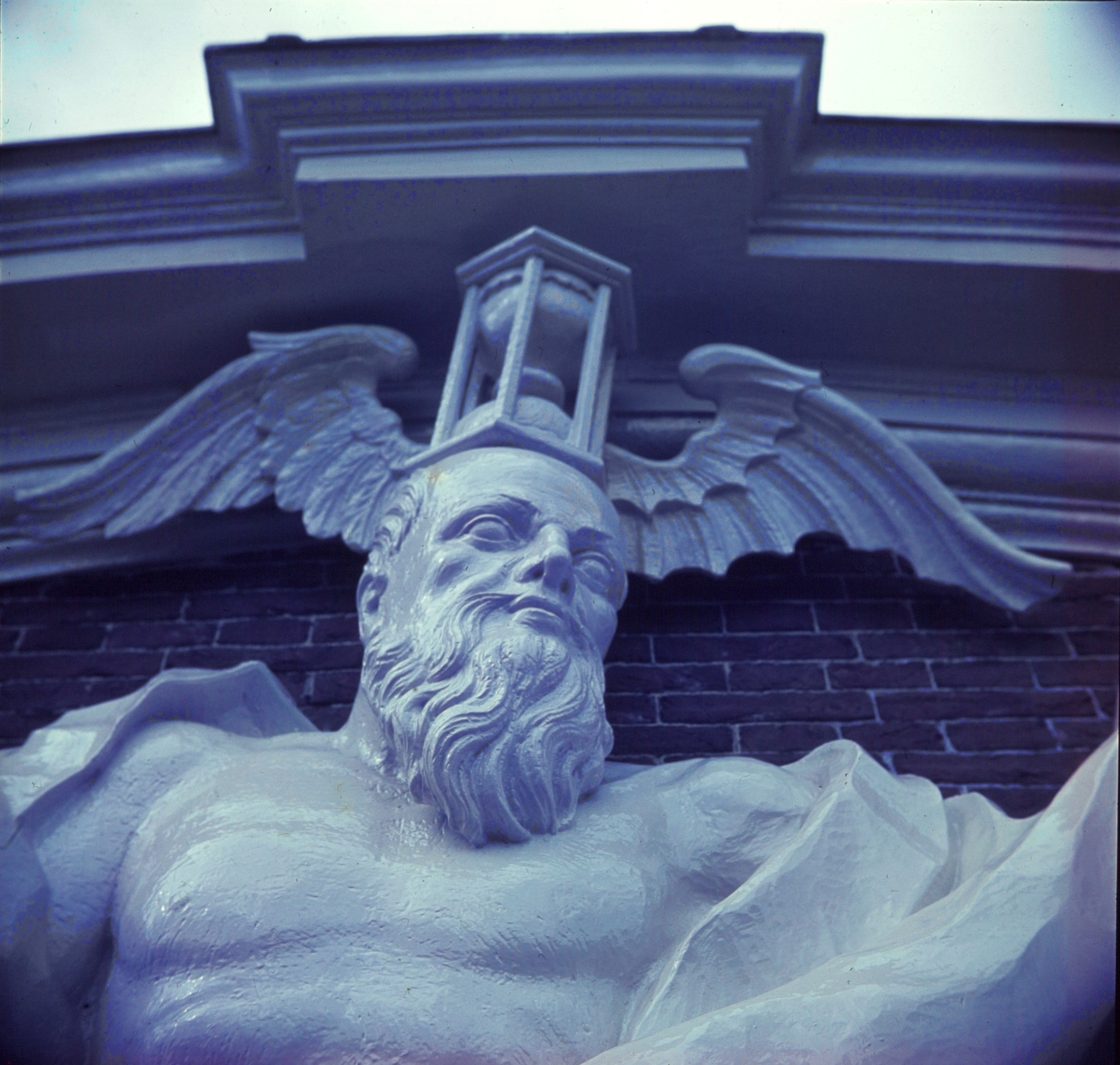 - Gedeelte van het beeld aan de gevel van het huis Chronos, Vader Tijd, gelegen aan het Vlak.