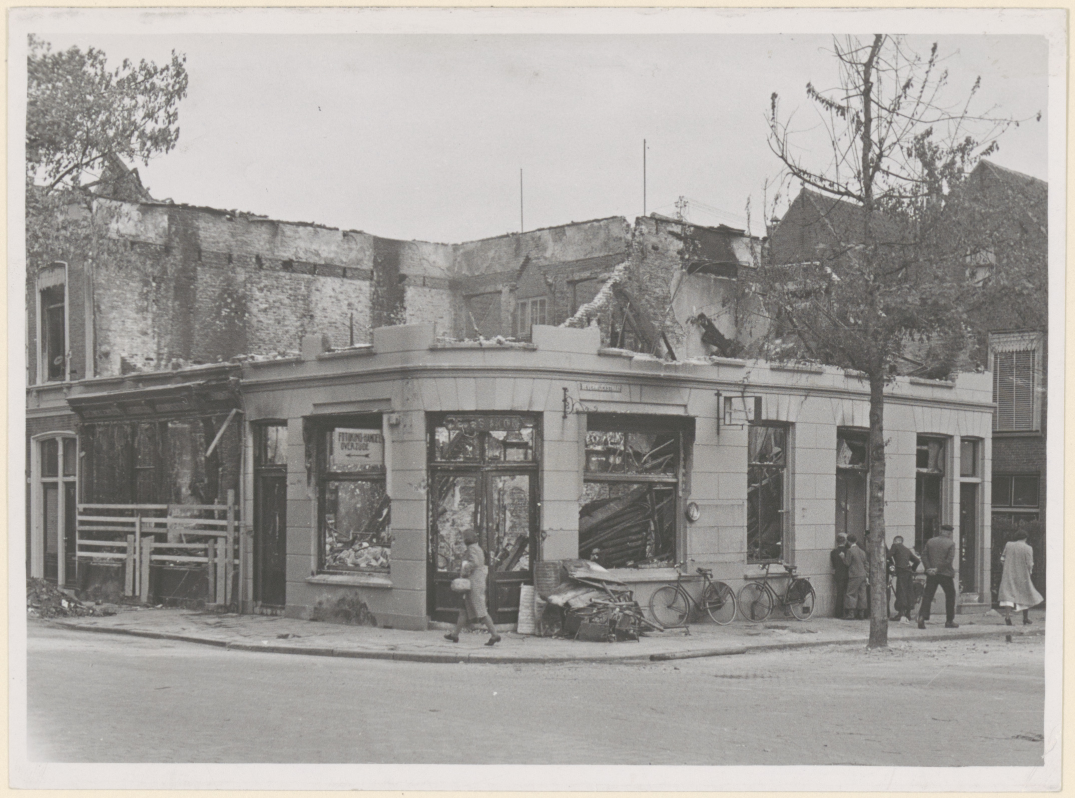De door oorlogshandelingen verwoeste fotowinkel van J.L. du Parant op de Albert Cuypsingel 191