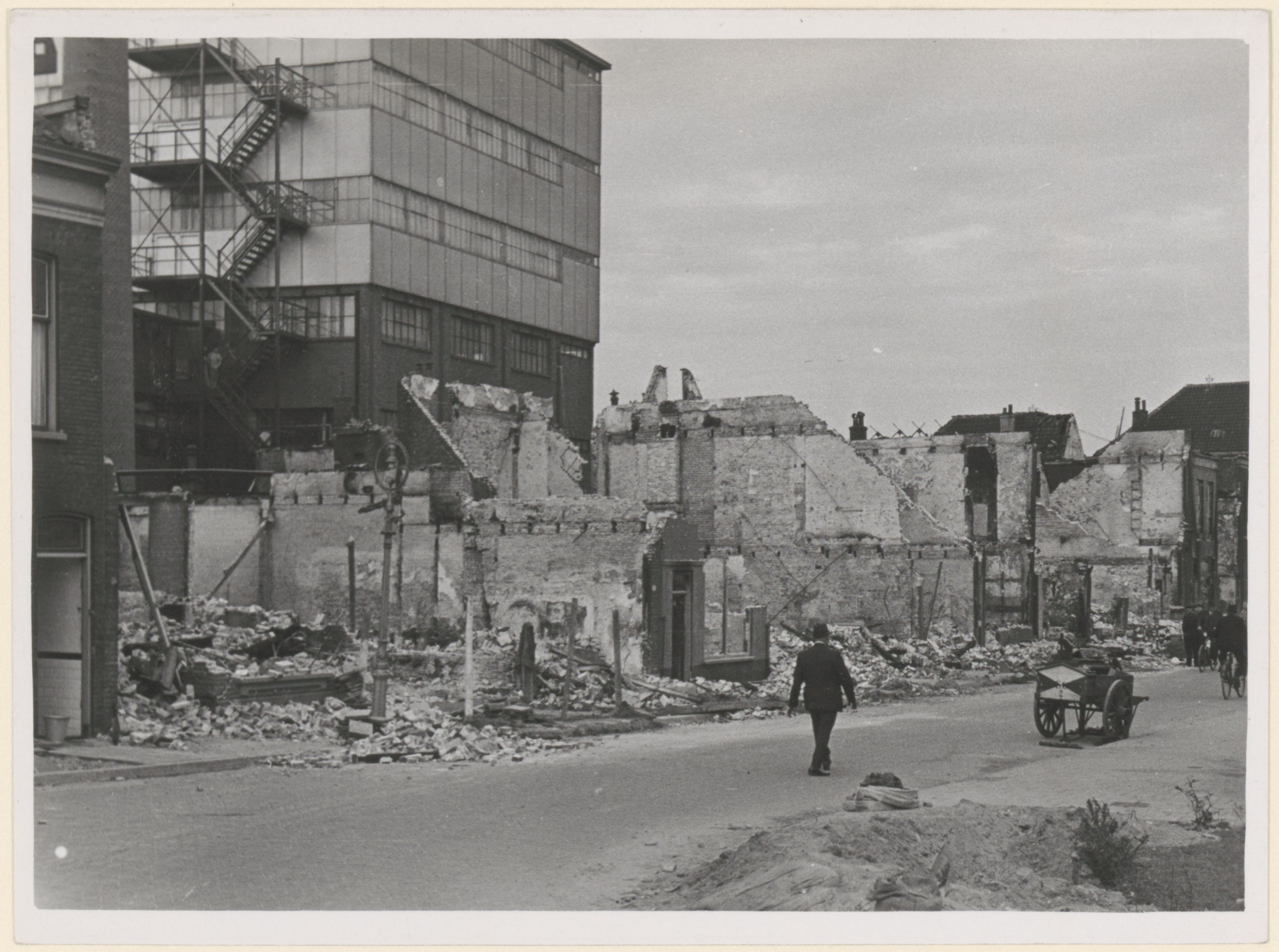 - beschietingen fabrieken handkarren oorlogsschades oorlogstijd Tweede Wereldoorlog voetgangers