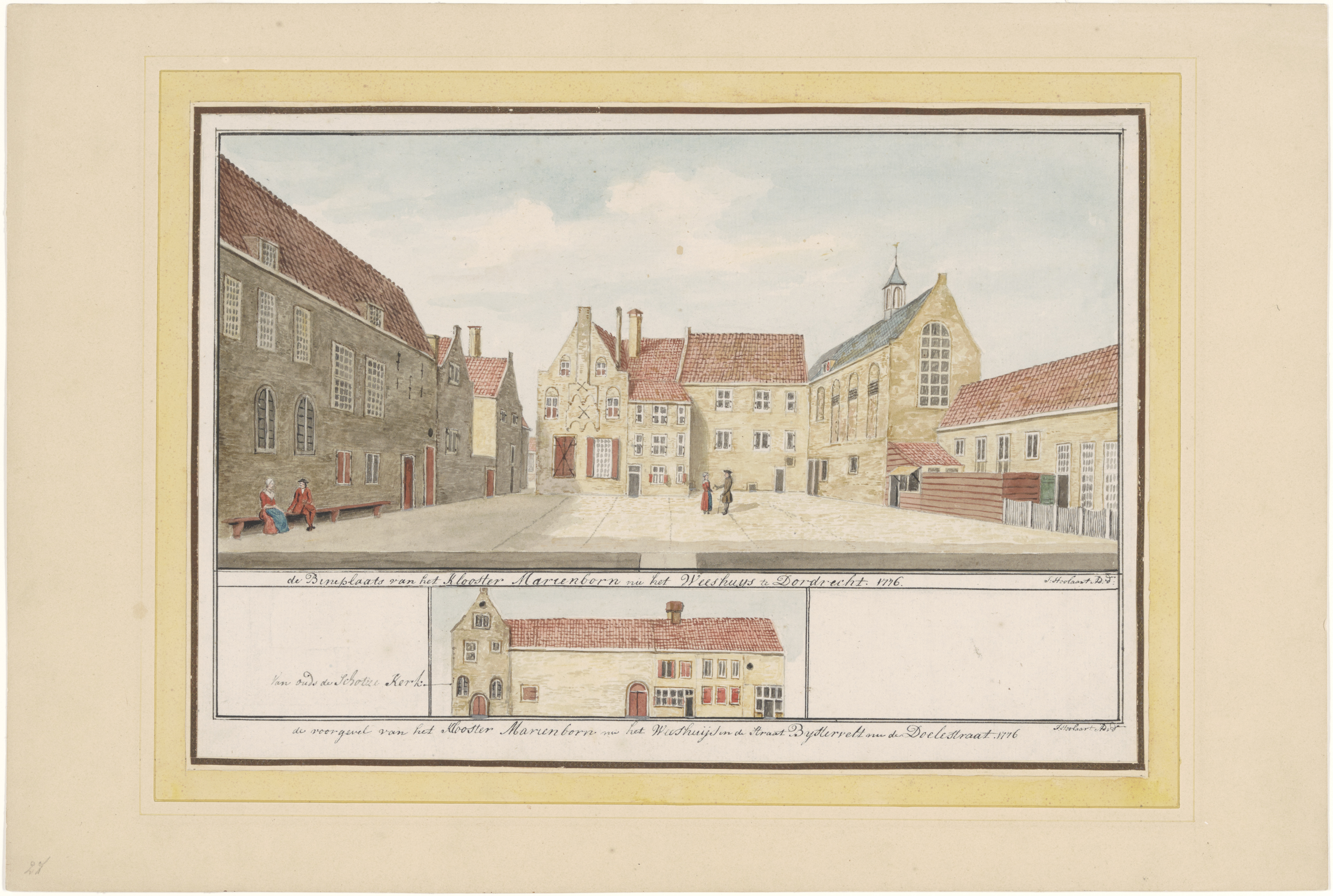 Een leuke maar ook informatieve tekening. Binnenplaats gezien naar het noordwesten richting de Voorstraat. Eerste kleine correctie: deze binnenplaats ìs nu het Weeshuisplein, ontstaan na sloop van de gebouwen links, rechts en achter de tekenaar. De tekenaar zit dus met zijn rug tegen de bebouwing aan de zuidoostzijde van de binnenplaats. Hij heeft de straatzijde van die bebouwing eronder weergegeven, dus de gevels aan de noordwestzijde van de Doelstraat / Wijngaardstraat, tussen de Weeshuisstraat links en de Mariënbornstraat rechts. Wat mij daarbij opviel is dat hij het pand links, hoek Doelstraat /Weeshuisstraat, nu dus de zuidelijke hoek van het Weeshuisplein, aanduid als vanouds de Schotse kerk. Op de grotere tekening zijn de 2 boogramen links (waar die 2 mensen op het bankje zitten) dan dus ook deel van de Schotse kerk. Rond 1820 was die voormalige kerk volgens de oorspronkelijke aanwijzende tafels in gebruik als pakhuis. En tenslotte was de Doelstraat kennelijk eerder bekend als het Bijstervelt.