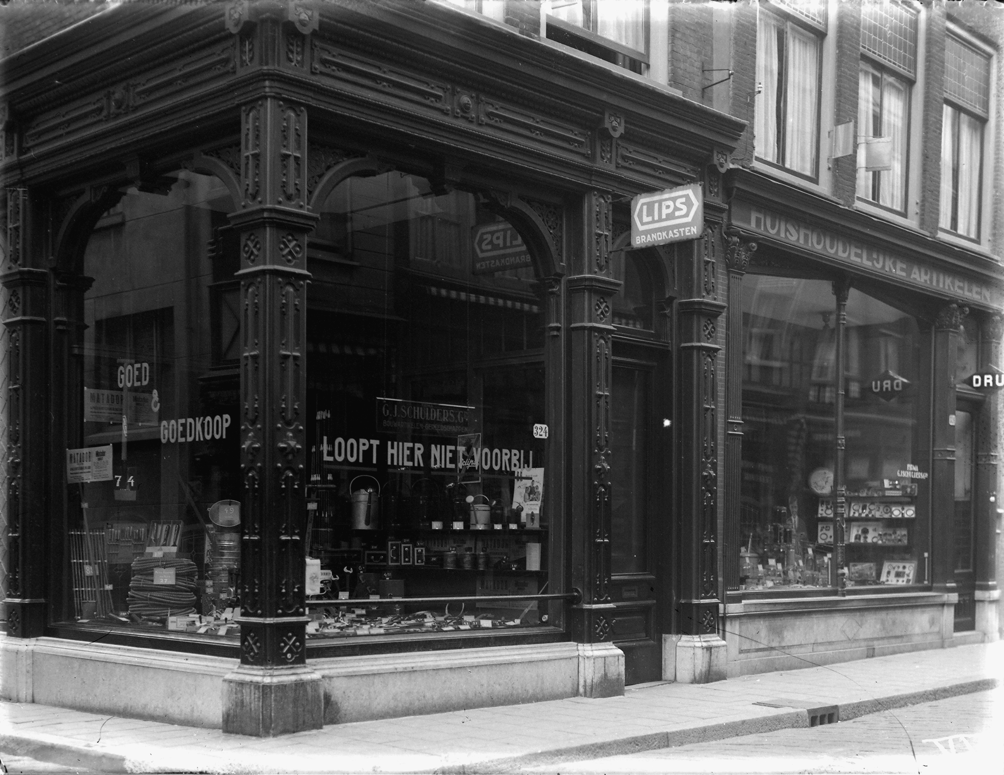 Winkelpanden van Labee en Schulders in de Voorstraat op de hoek van de Pelserstraat …