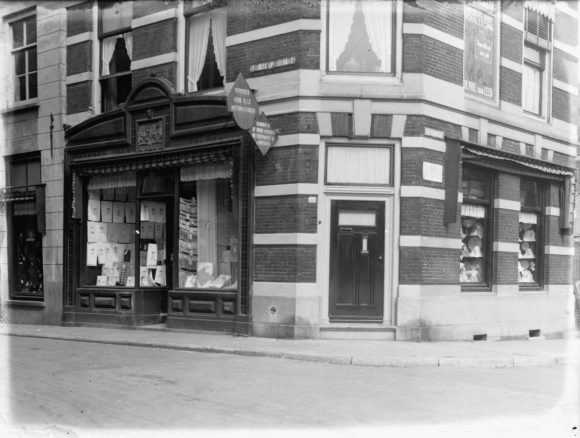 Textielwinkel 'De Pril van Leen' op de hoek Grote Spuistraat/Elfhuizen (rechts).