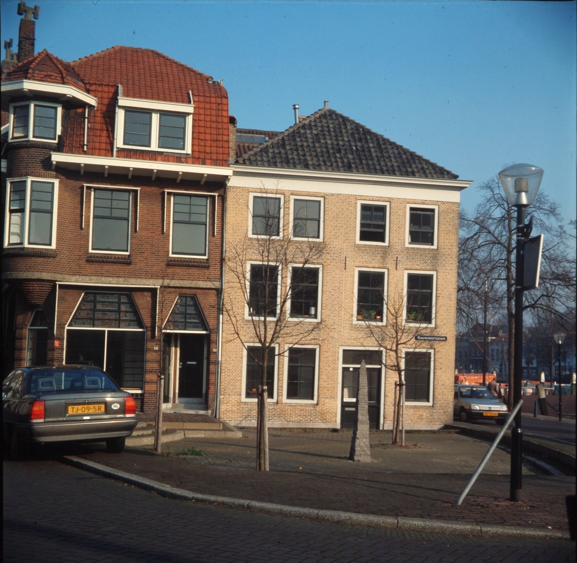Gezicht op de huizen aan het Blauwpoortsplein, na de restauratie, rechts de Nieuwe Haven, links de ingang van de Hoge Nieuwstraat (later is in het linker pand een café-restaurant gekomen).