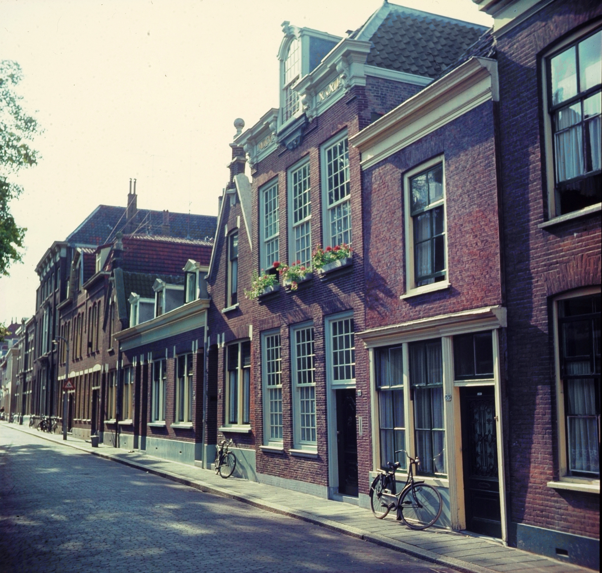Gevels aan de Hoge Nieuwstraat, het middelste pand (met de bloembakken) is geheel …