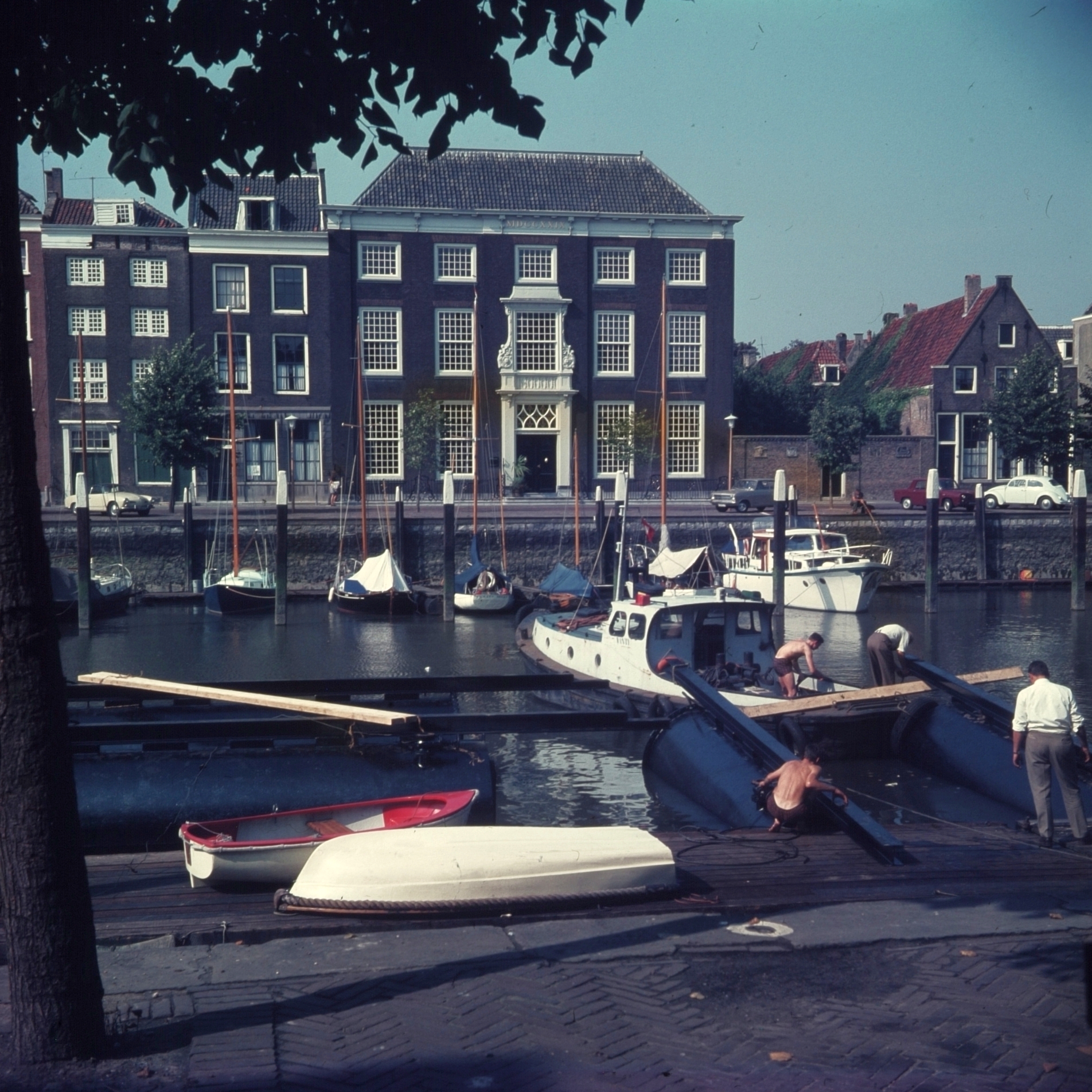 - Op de voorgrond werkzaamheden aan het vlot in de haven; op de achtergrond het museum mr. Simon van Gijn (na de restauratie) aan de Nieuwe Haven, gezien vanaf de Knolhaven.