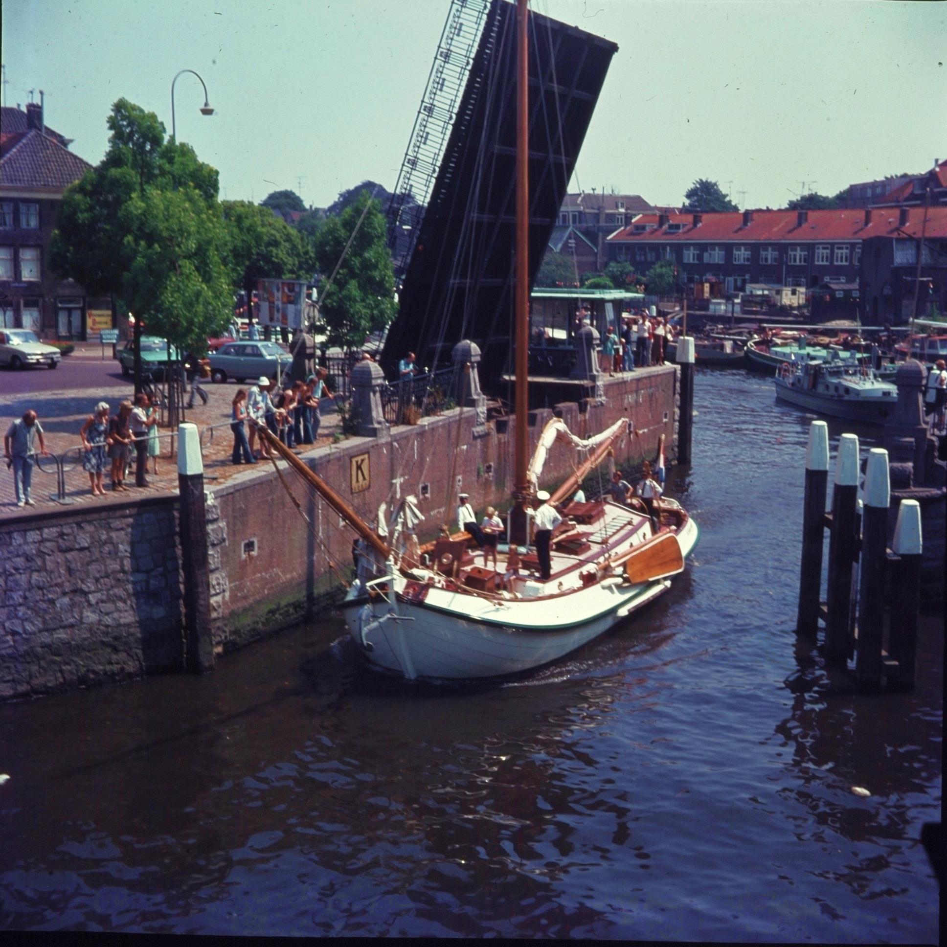 - Het zeilschip de Groene Draeck (van de koninklijke familie) verlaat de Nieuwe Haven. De Engelenburgerbrug staat hier voor open; geheel links het Blauwpoortsplein.
