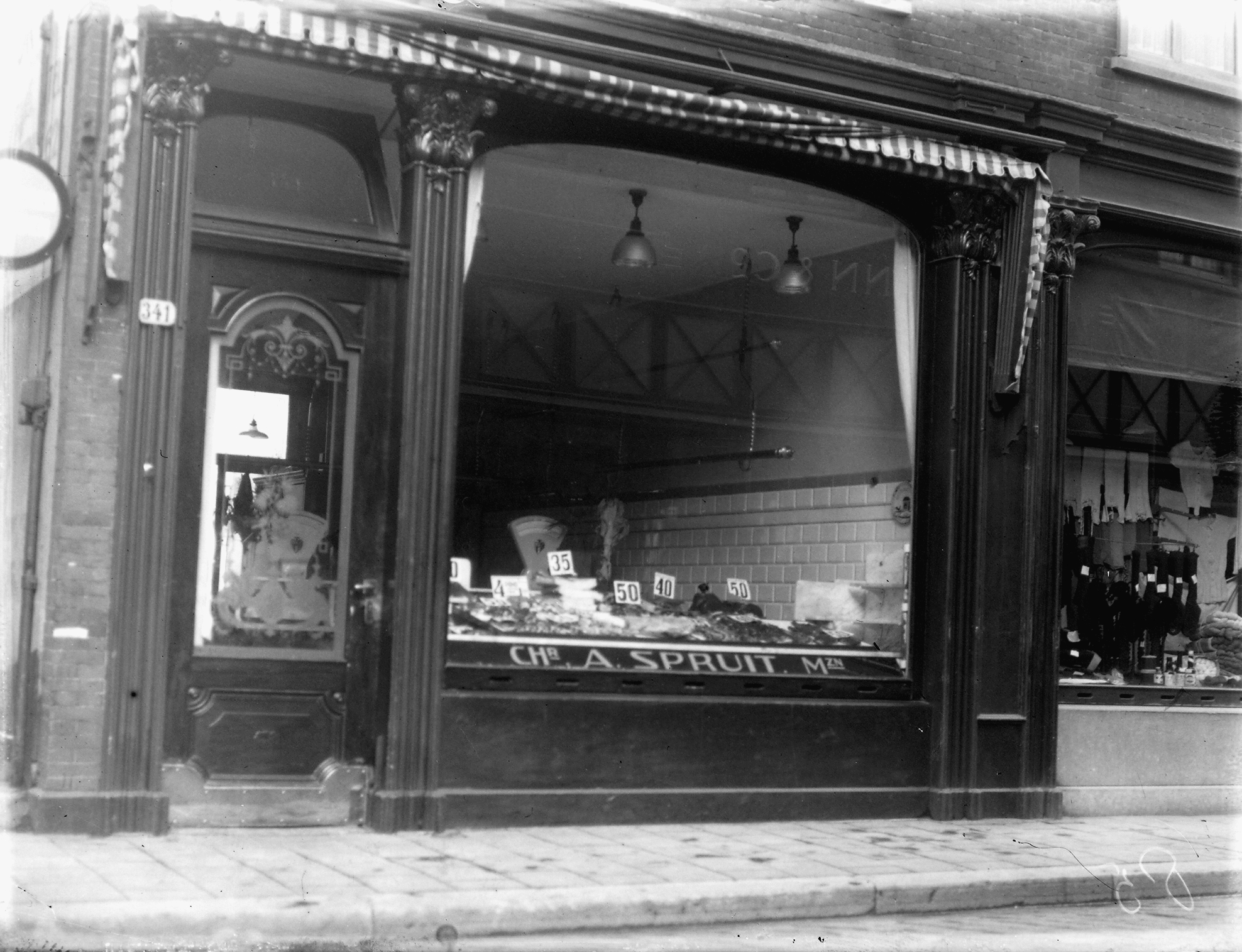 Slagerij Chr. A. Spruit in de Voorstraat op de hoek van de Botgenssteiger (links).