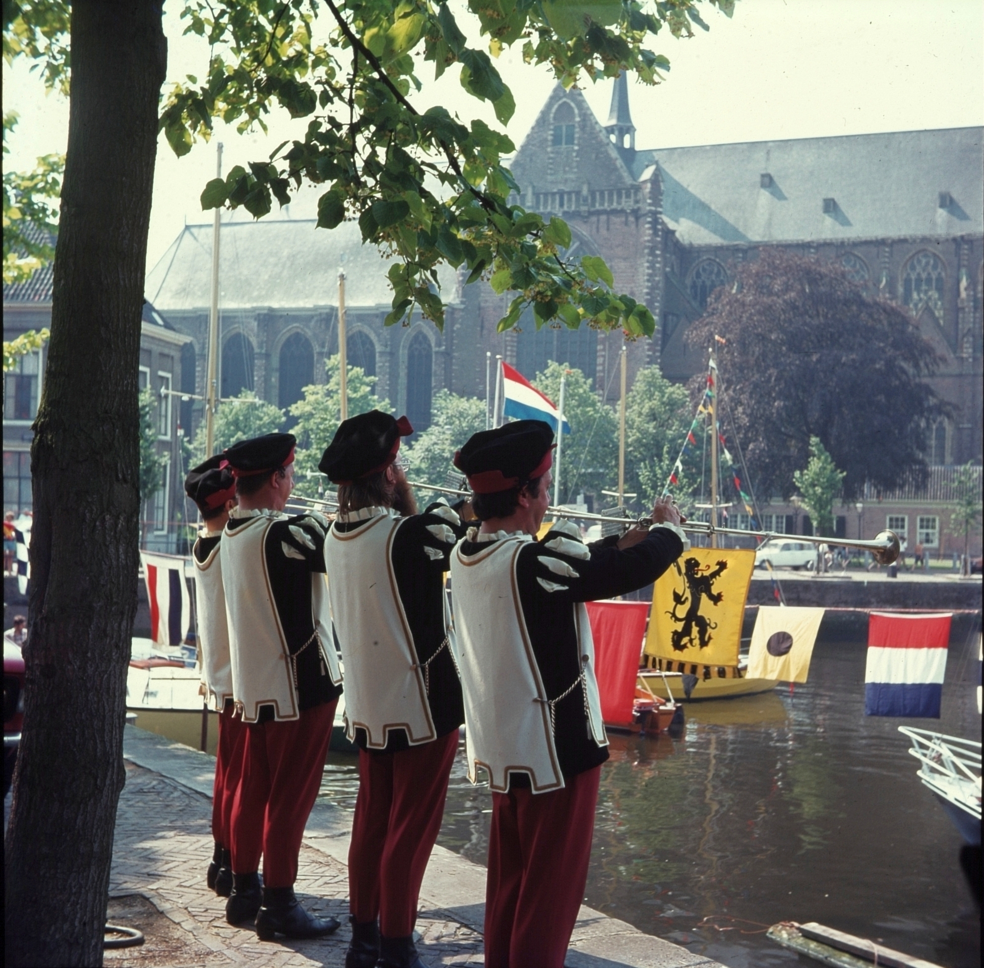 - Herauten spelen bij een speciale gelegenheid aan de Korte Engelenburgerkade; op de achtergrond de Grote Kerk aan de Lange Geldersekade.