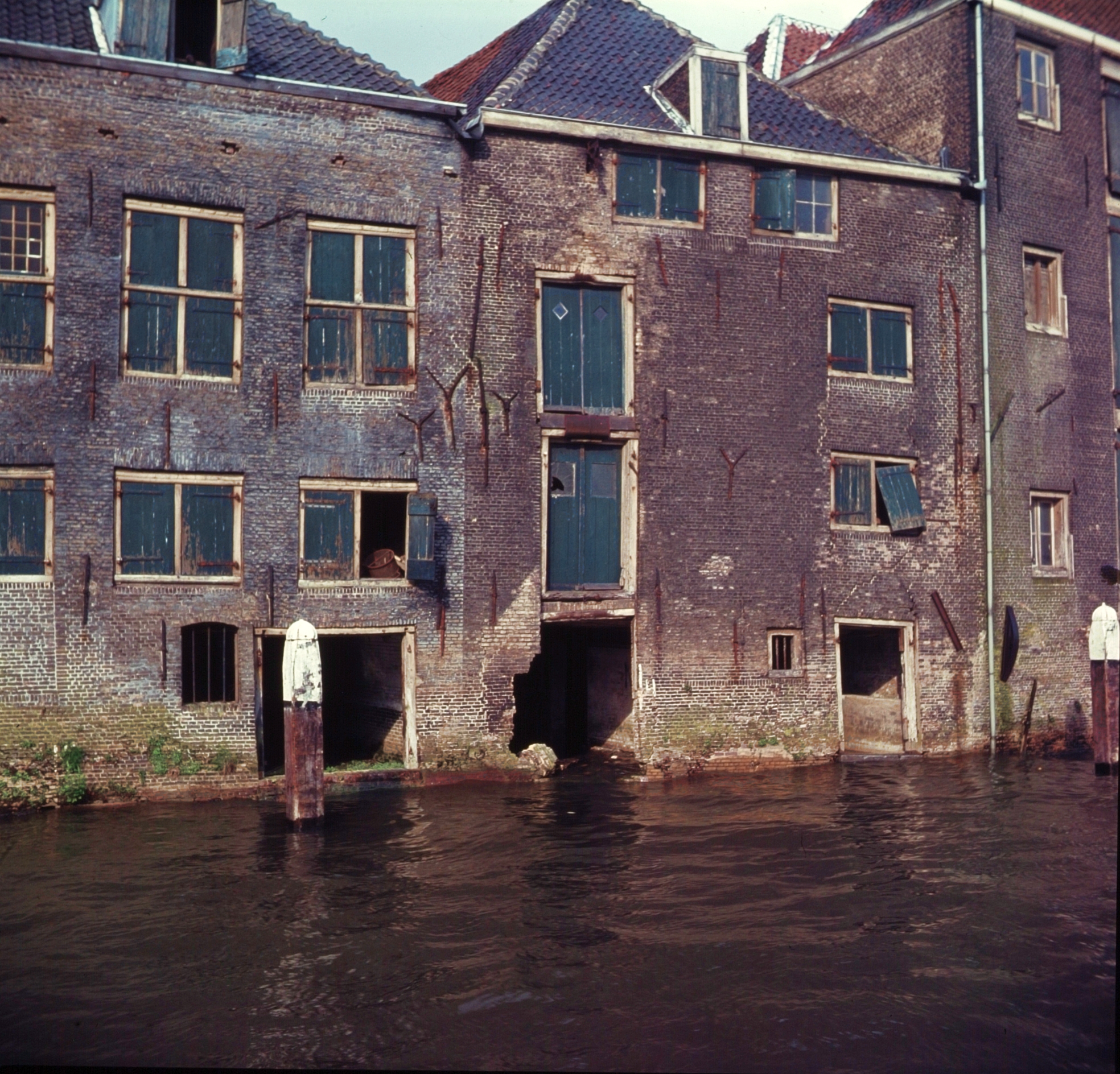 Bouwvallige pakhuizen (watergevels) de achterkant van de Korte Engelenburgerkade.