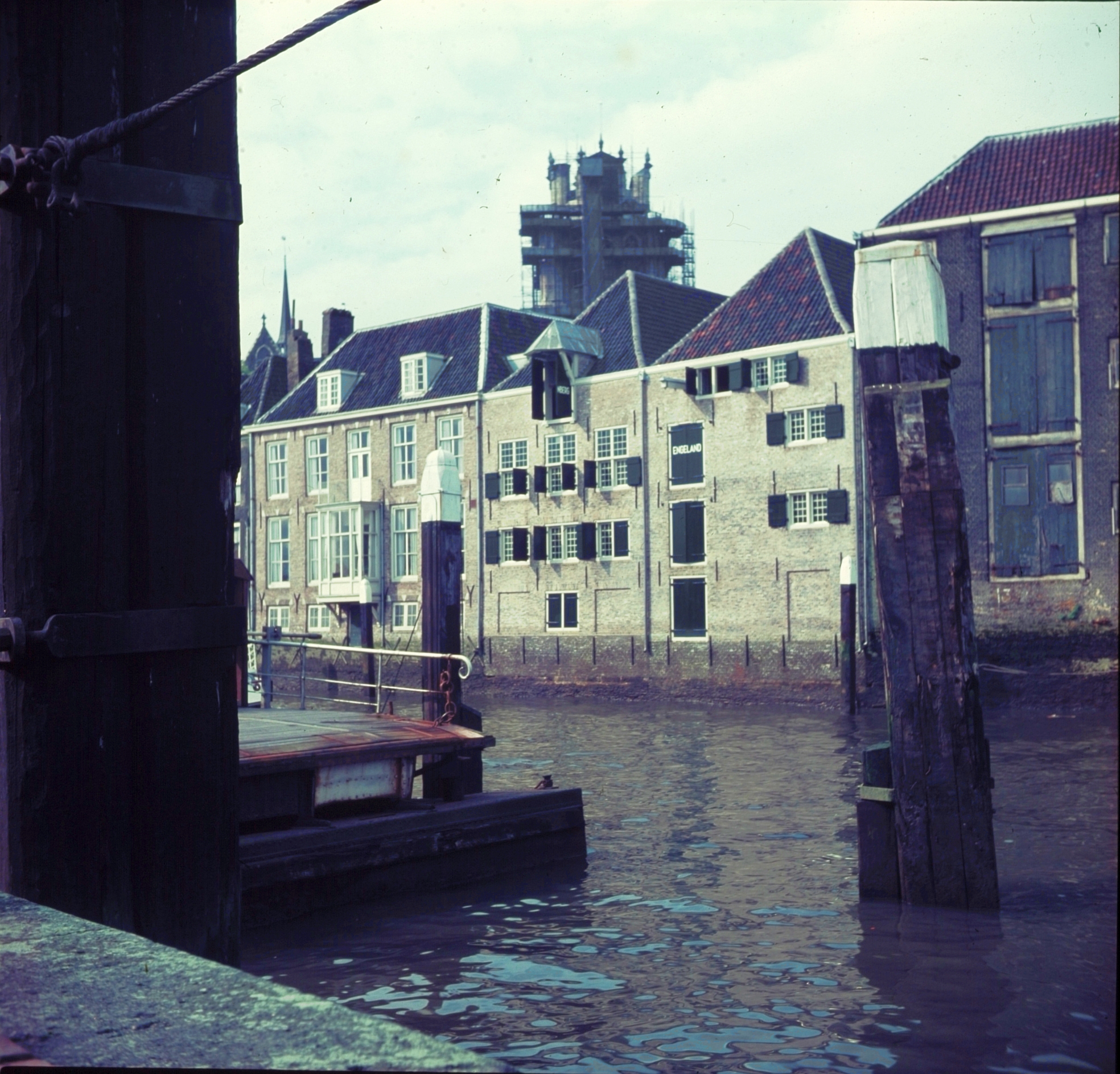 - De gerestaureerde watergevels van de pakhuizen die aan de Korte Engelenburgerkade staan, gezien vanaf het Blauwpoortsplein; op de achtergrond de toren van de Grote Kerk in de steigers.
