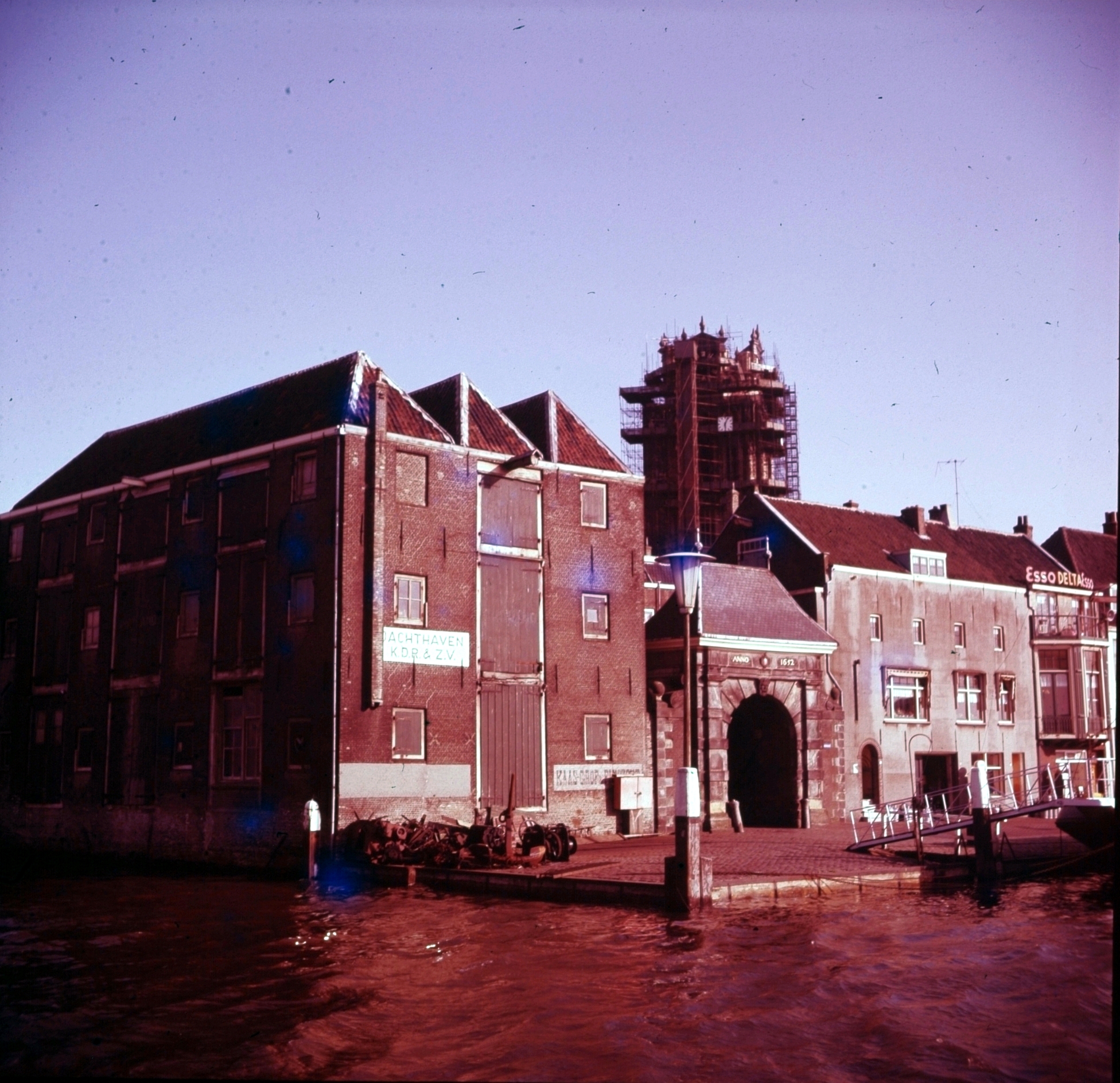 - De Hooikade vanaf het water gezien; geheel links pakhuis Rusland, daarnaast de Catharijnepoort in de verte de toren van de Grote Kerk in de steigers.
