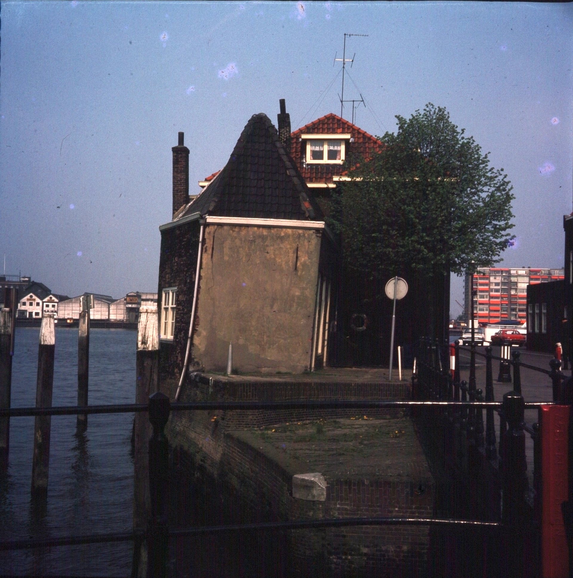 - Het Zakkendragershuisje aan de Mazelaarsstraat gezien over de Mazelaarsbrug (vroeger Zakkendragersbrug) vanaf de Korte Gelderse Kade; in de verte over het water de huizen in Zwijndrecht.