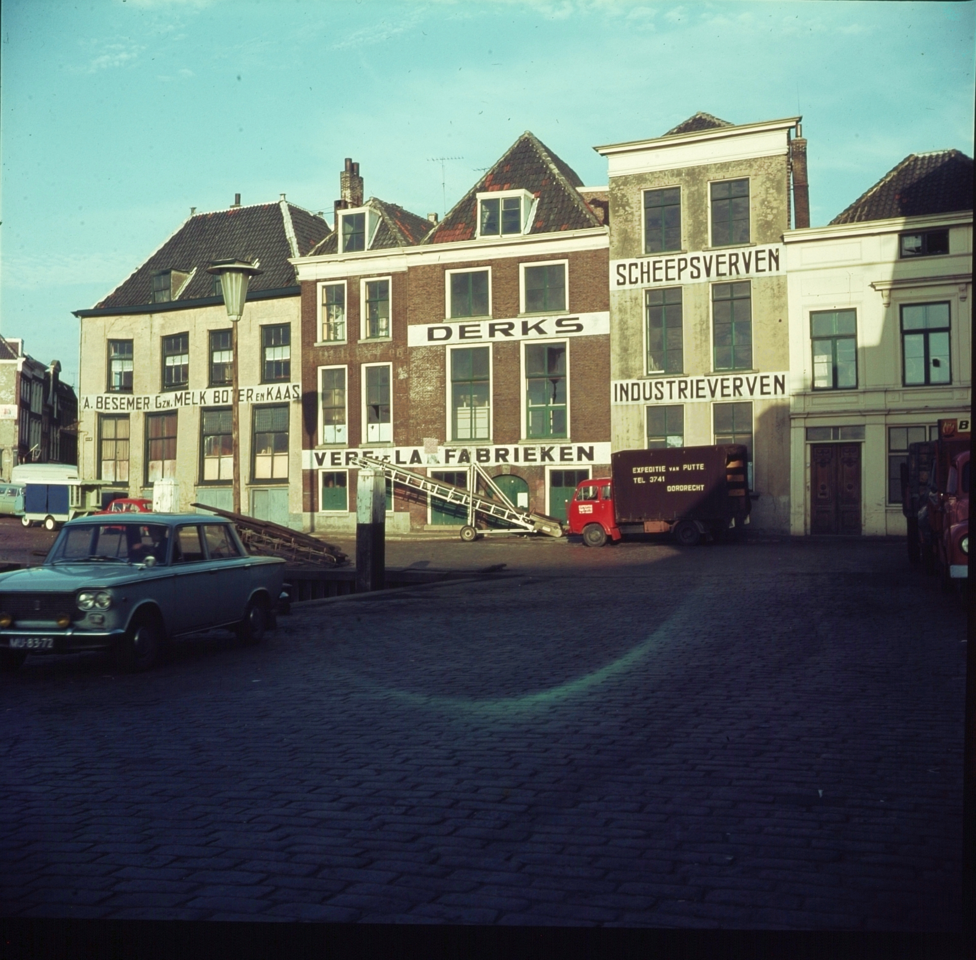 - De Bomkade met de bedrijven Besemer Melk, Boter en Kaas en Derks Verffabriek, voor de verffabriek staat een loopband en een wagen van Expeditietbedrijf van Putte uit Dordrecht.