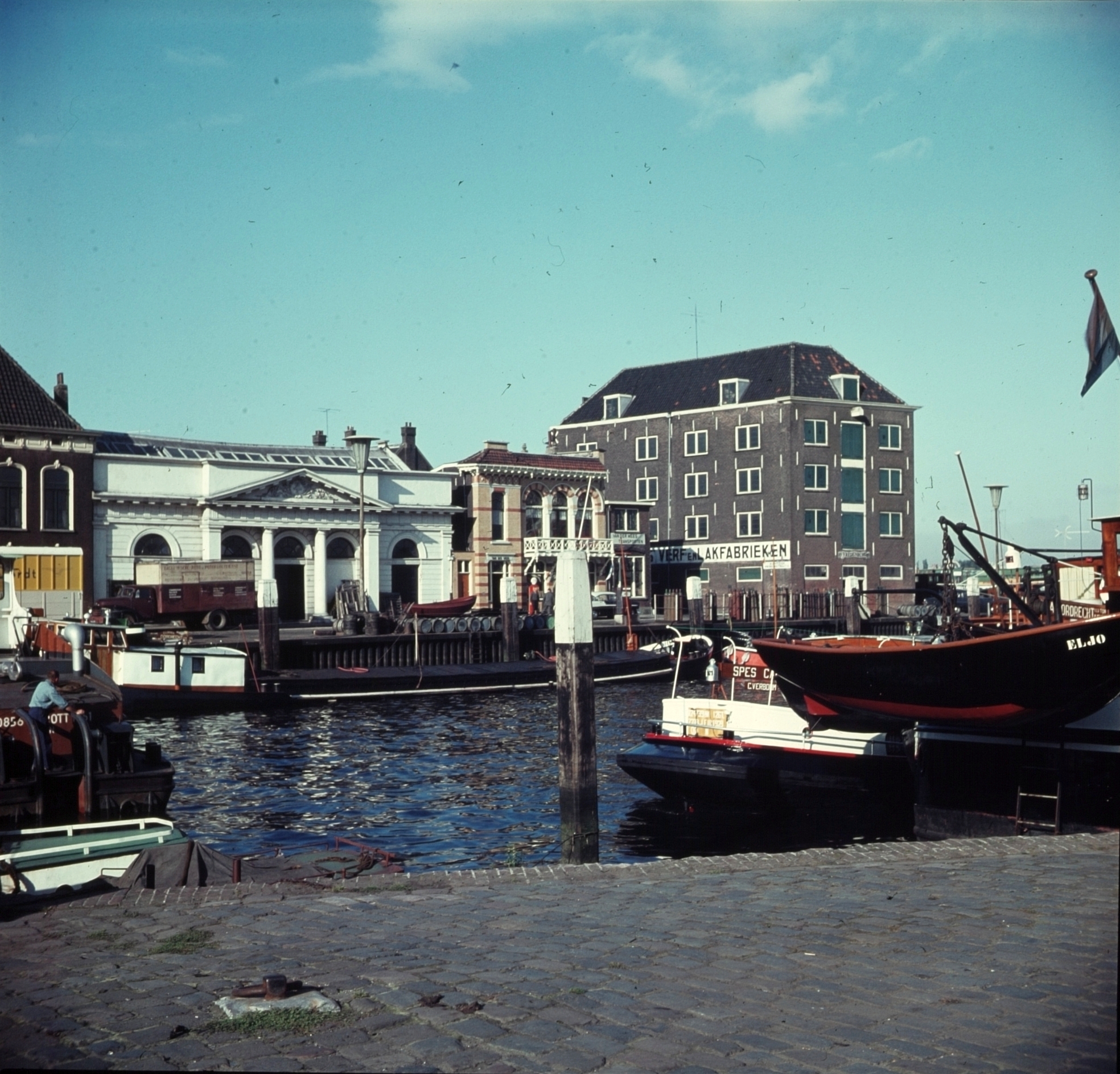 - Gezicht op de Korenbeurs en pakhuis Vredenburg (waarin gevestigd Derks verffabriek) aan de Bomkade.