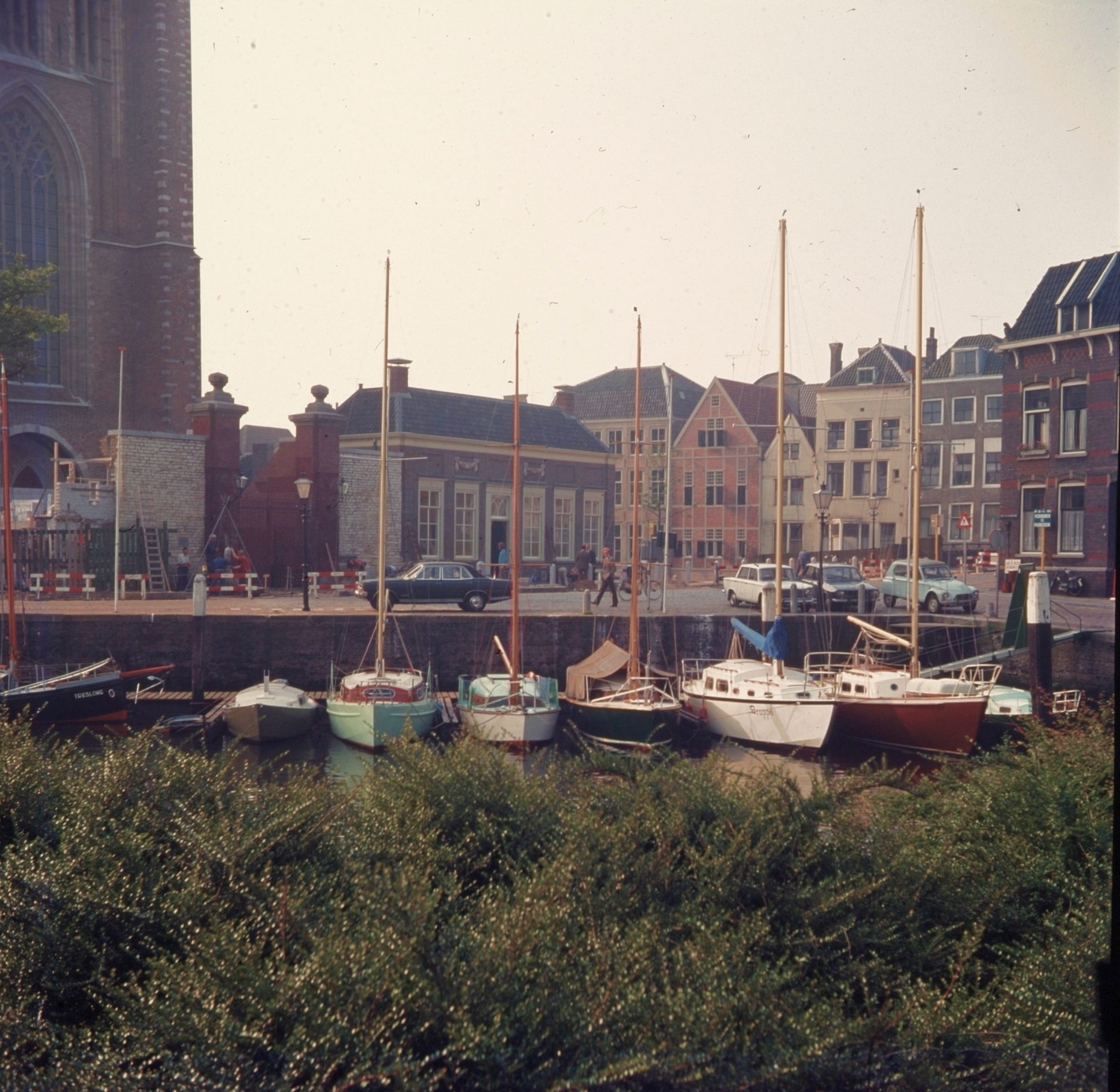 - Het Maartensgat, gezien naar de hoofdingang van de Grote Kerk, die zo te zien gerestaureerd wordt, daarnaast het Rotterdamse Huis; de huizenrij in de verte is de Voorstraat, uiterst rechts is de Korte Geldersekade.
