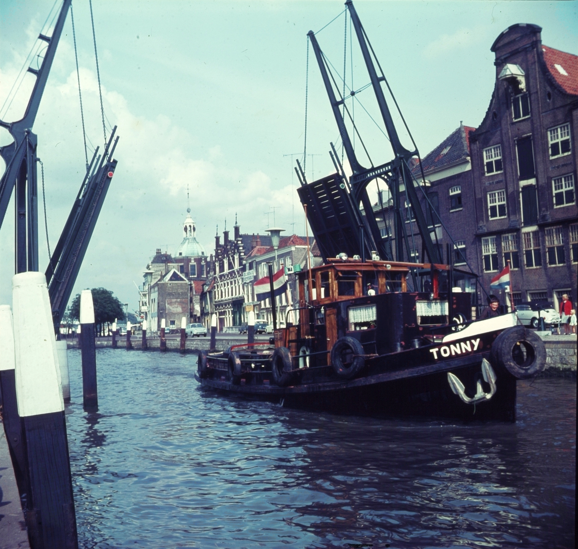 - De sleepboot Tonny vaart de Wolwevershaven binnen, de Damiatebrug staat hier voor open, geheel rechts pakhuis Oldenborch (klokgevel), in de verte de Groothoofdstoren aan het Groothoofd.