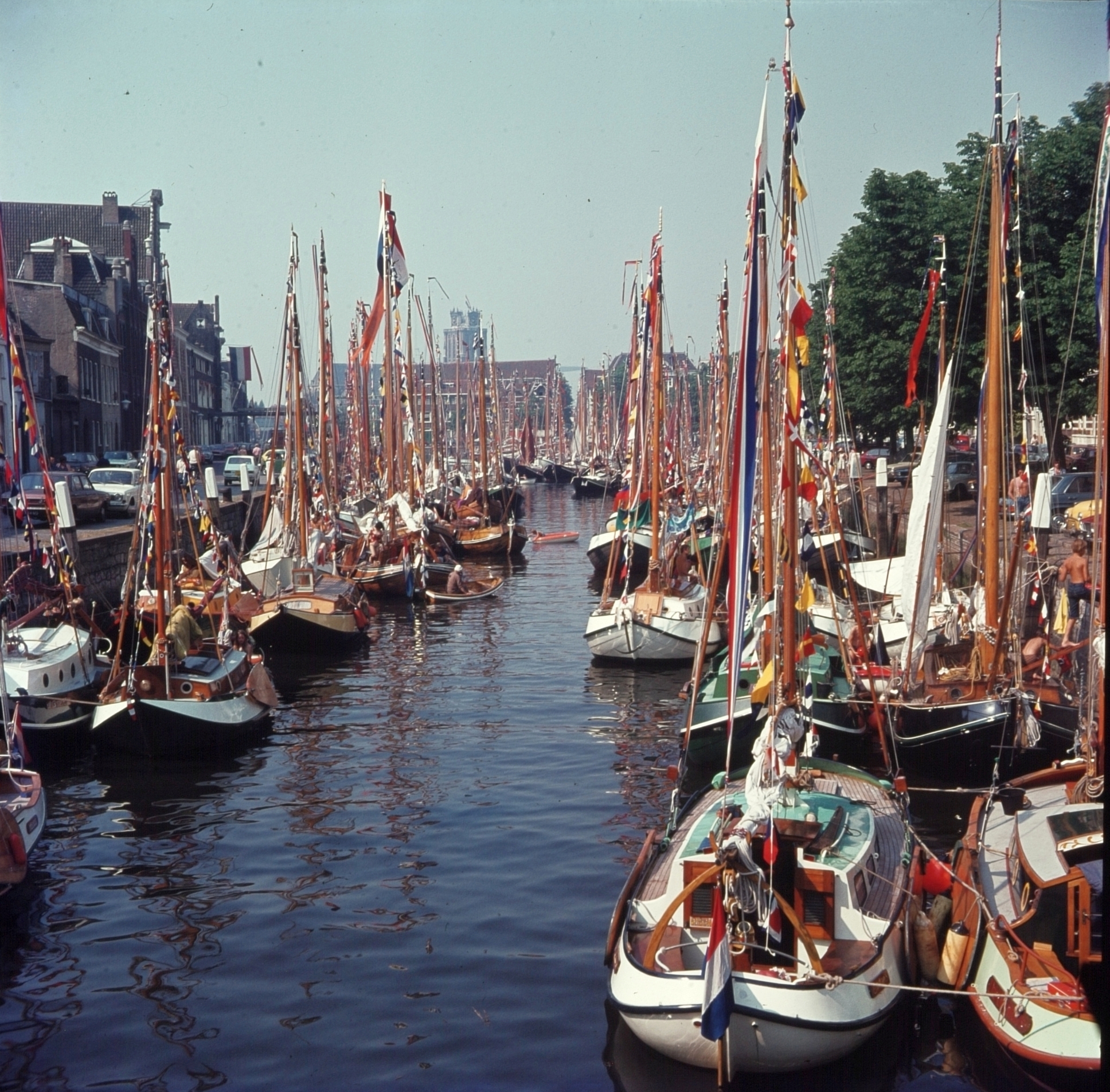 - Zeilboten liggen klaar voor een vlootschouw van overwegend zalmschouwen tijdens een evenement in de Wolwevershaven. Links de Kuipershaven, in de verte de Grote Kerk.