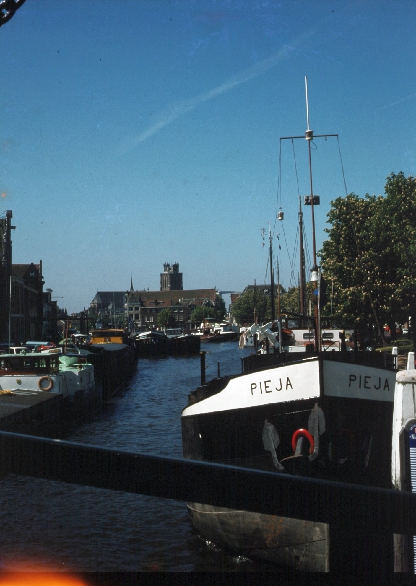 - De Wolwevershaven met binnenvaartschepen gezien richting het Vlak, in de verte de Grote Kerk.