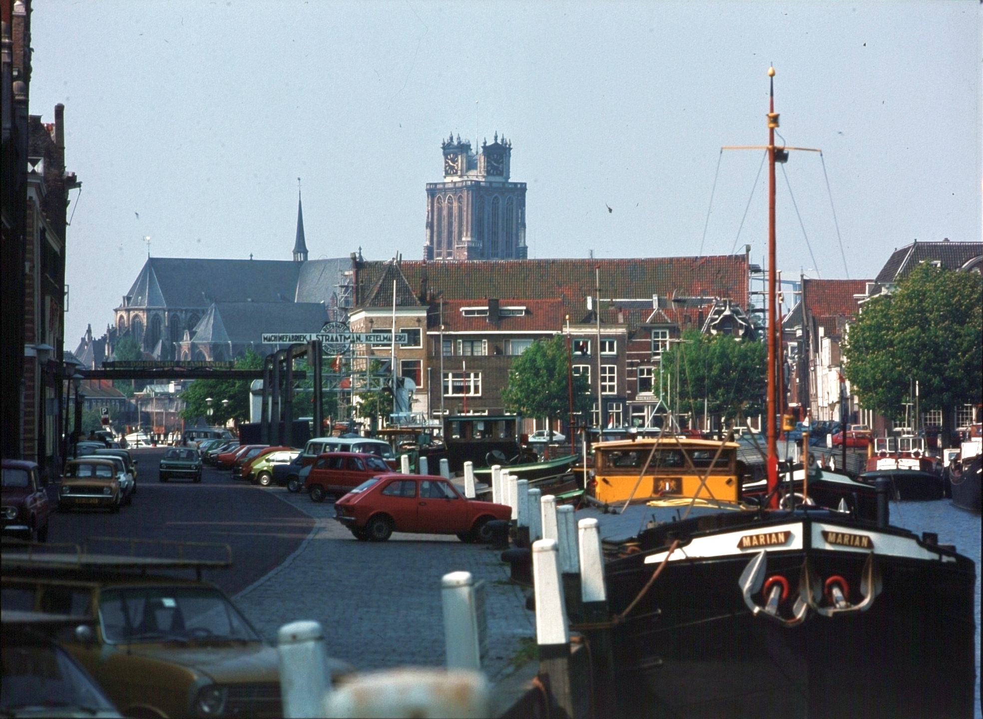 - Auto's geparkeerd op de kade van de Kuipershaven, verderop links het Dok van de machinefabriek van Straatman, daarachter de huizen aan het Vlak in de verte een goed zicht op de Grote Kerk.