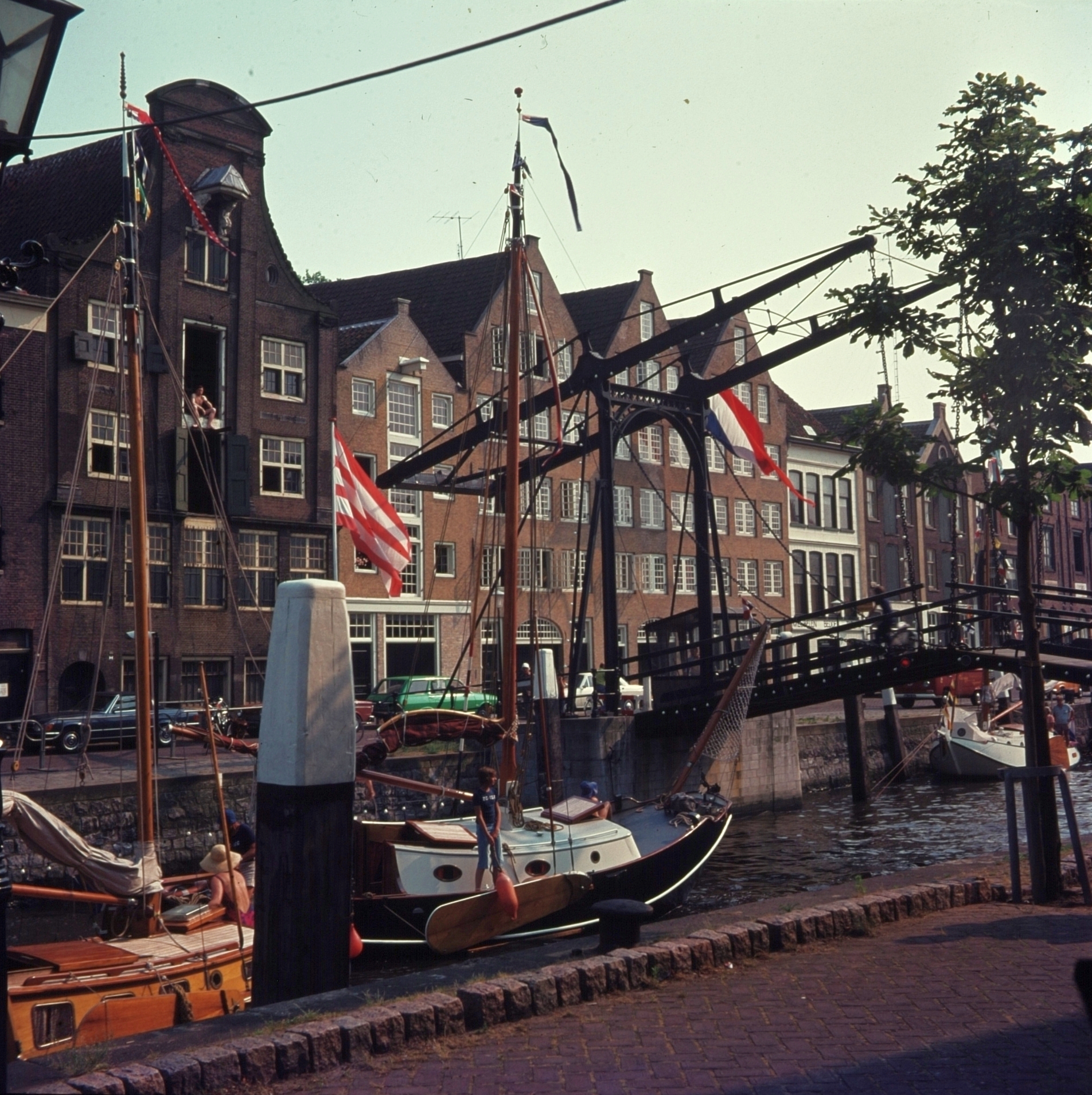 - Pleziervaart wacht totdat de Damiatebrug open gaat, aan de overkant pakhuizen of koopmanshuizen aan de Kuipershaven, links pakhuis Oldenborch met de klokgevel; gezien van het Damiatebolwerk.