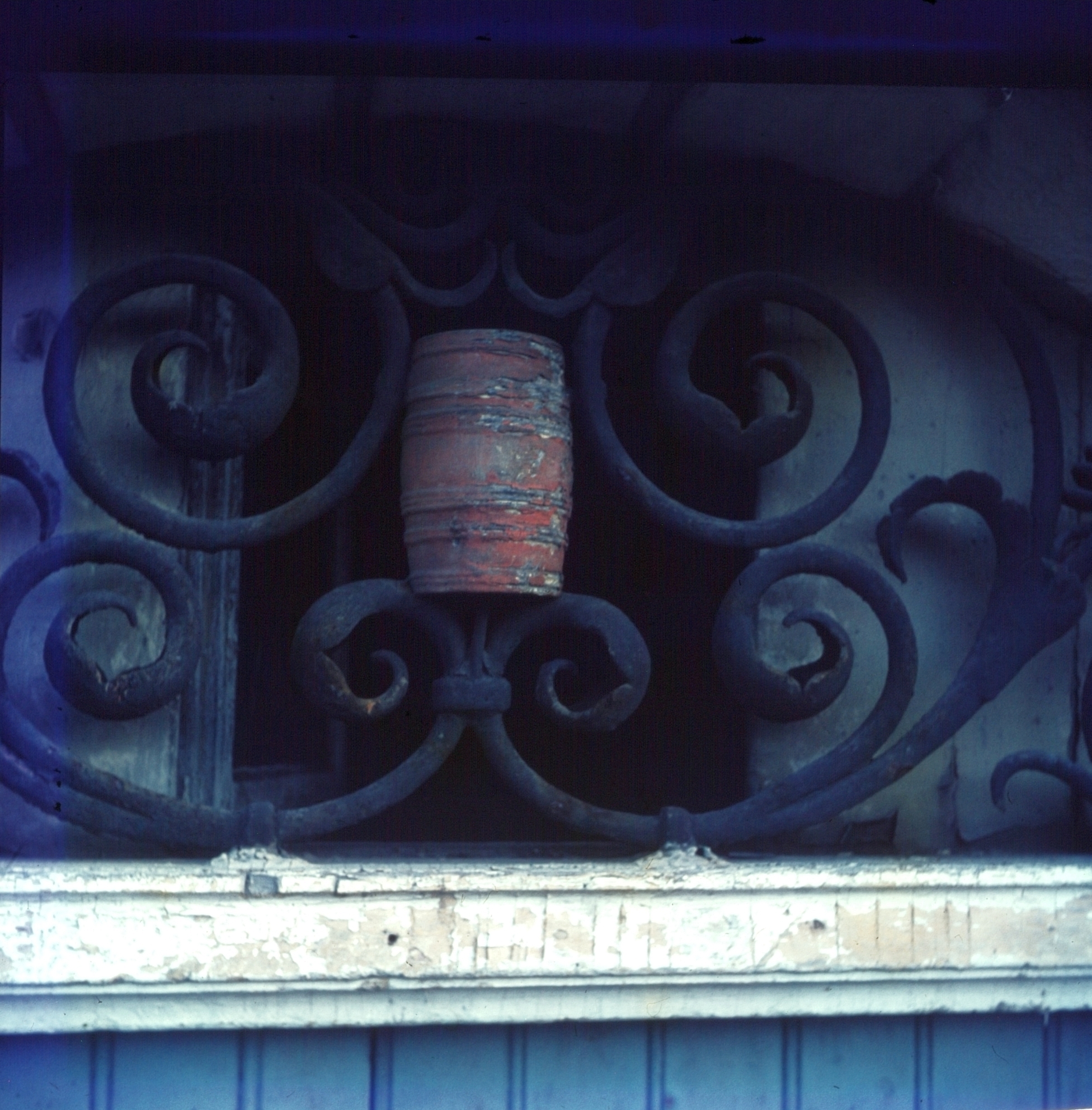 - Detailopname van een versierd bovenlicht van een pakhuis aan de Kuipershaven, op de hoek van de Schrijversstraat.