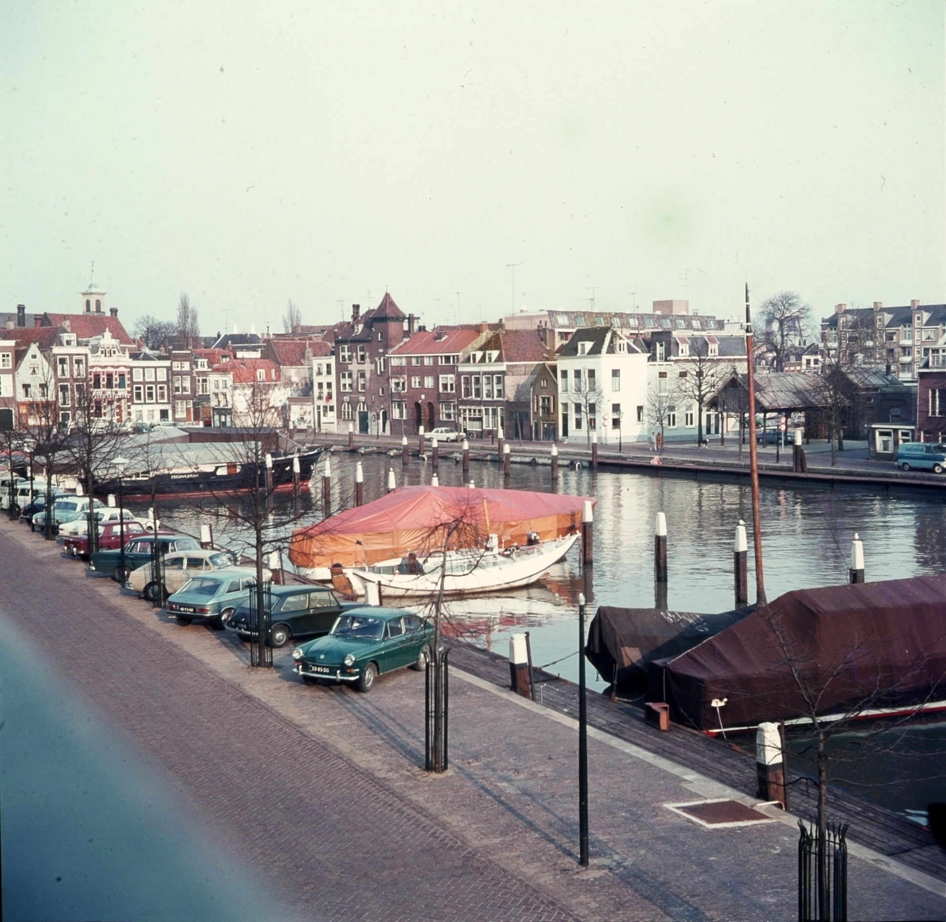 - Vooraan auto's geparkeerd op de kade van de Nieuwe Haven, enkele boten liggen in de Nieuwe Haven, aan de overkant rechts de Vismarkt en de huizen aan de Knolhaven, achterin de huizen aan de Aardappelmarkt, in de verte de toren van de Bonifatiuskerk aan de Wijnstraat.