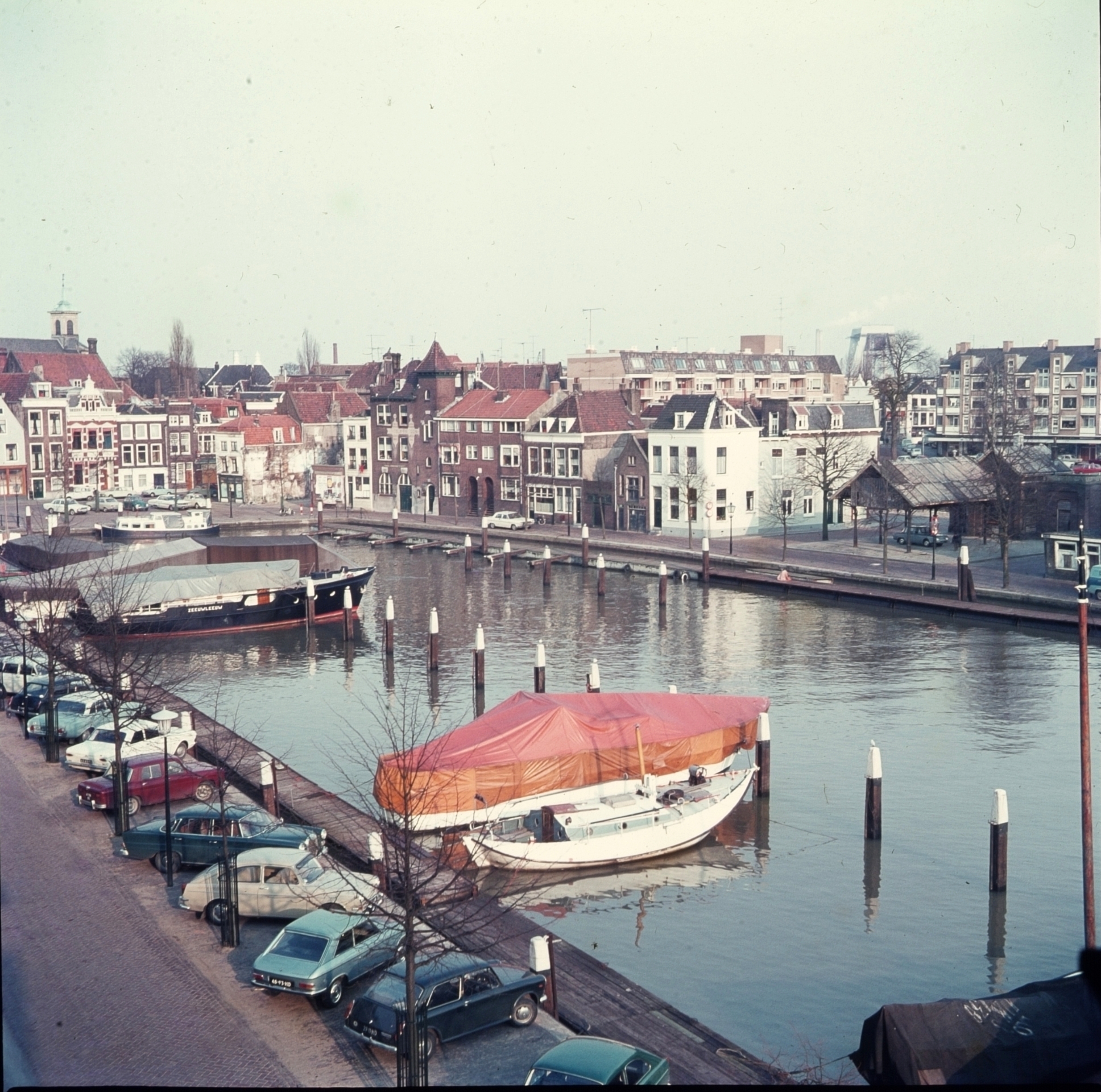 - Vooraan auto's geparkeerd op de kade van de Nieuwe Haven, enkele boten liggen in de Nieuwe Haven, aan de overkant rechts de Vismarkt en de huizen aan de Knolhaven, achterin de huizen aan de Aardappelmarkt, in de verte de toren van de Bonifatiuskerk aan de Wijnstraat.