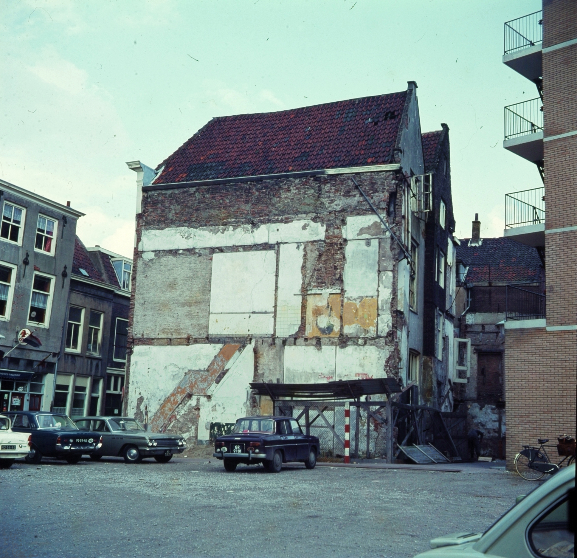 - Parkeerplaats op de hoek Varkenmarkt, Aardappelmarkt en Gravenstraat (hier is pas een huis afgebroken); geheel links de ingang naar de Gravenstraat, geheel rechts een nieuwbouw appartementen-complex dat aan de Grote Markt staat.