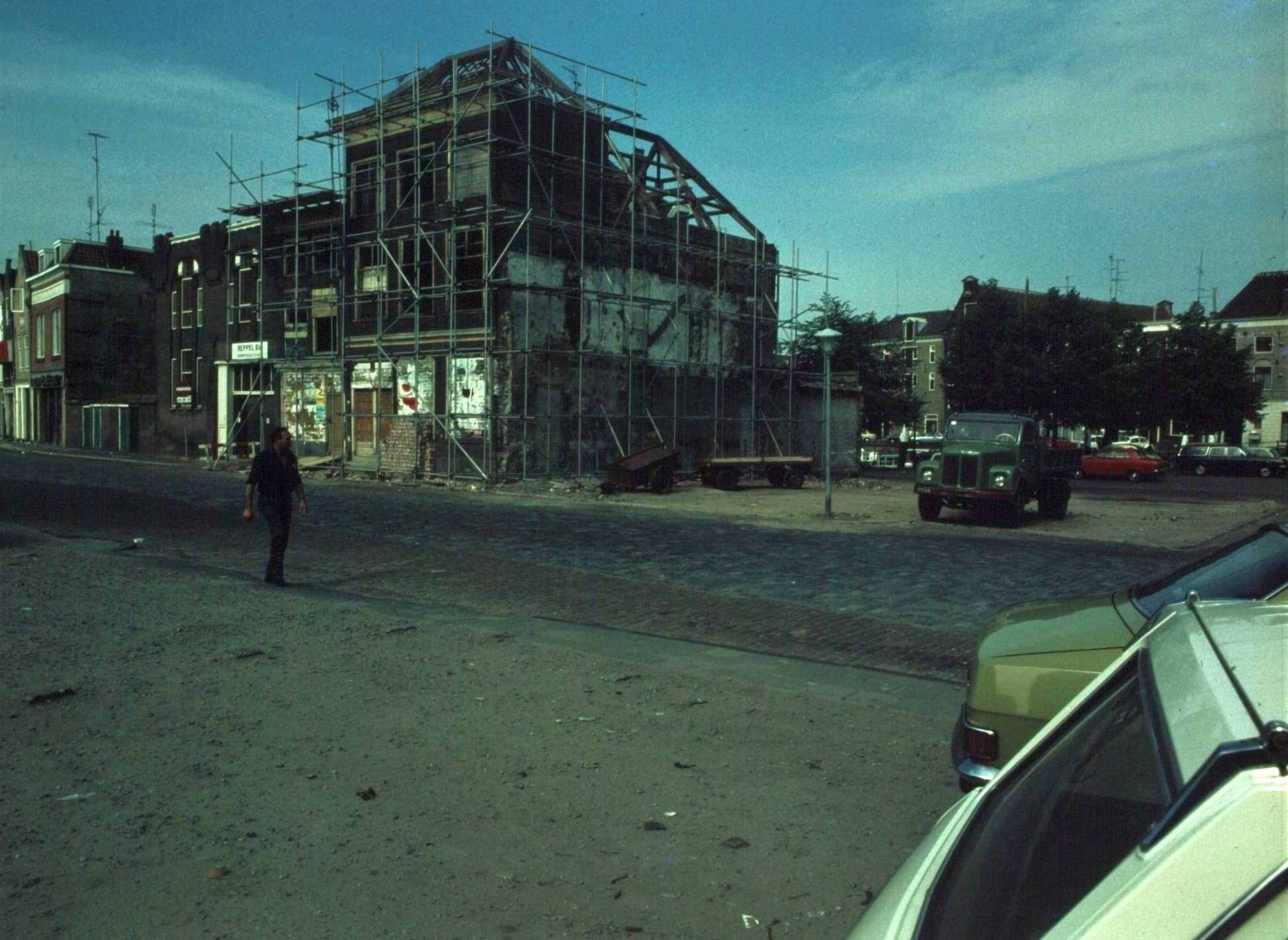 - Bouwwerkzaamheden op de Varkenmarkt rechts van het pand in de steigers zijn al huizen gesloopt; gezien vanaf de Aardappelmarkt; de bomen rechts staan op de parkeerplaats van de Aardappelmarkt.