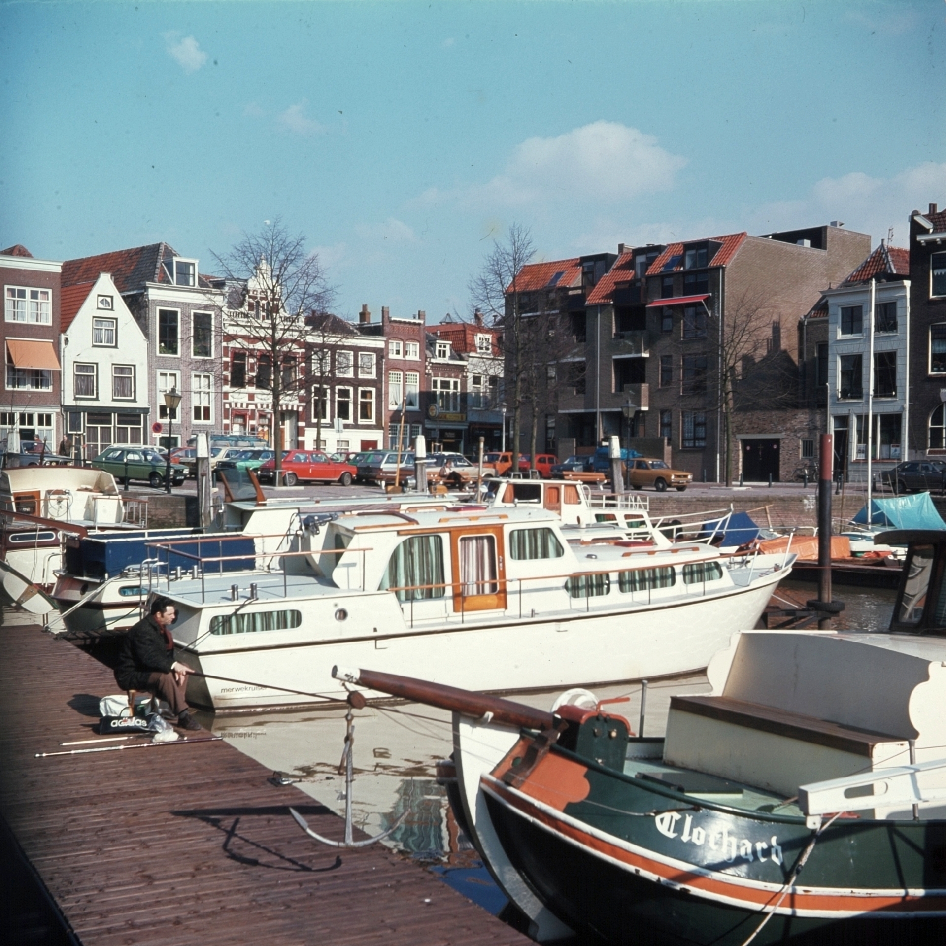 - Plezierboten in de Nieuwe Haven, geheel rechts de Knolhaven, links daarvan de nieuwbouw en de parkeerplaats met daarachter de bebouwing aan de Aardappelmarkt