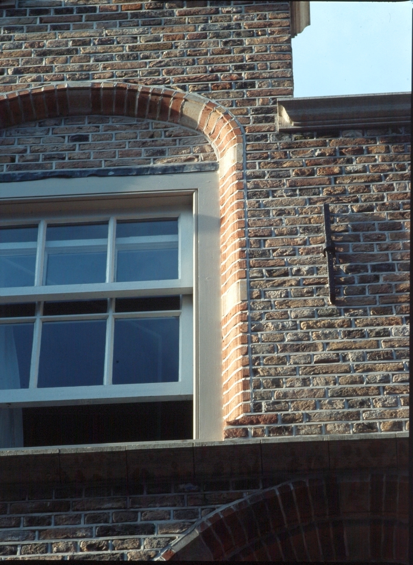 - Detailopname van een huis met een schuifraam bestaande uit kleine ruitjes, aan de Vleeshouwersstraat.