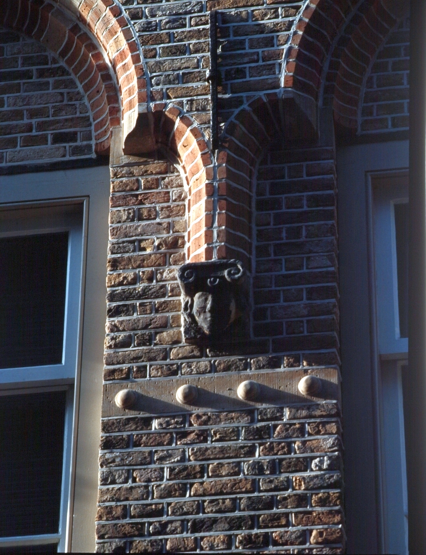 - Detailopname van een gevelversiering van een huis aan de Vleeshouwersstraat.