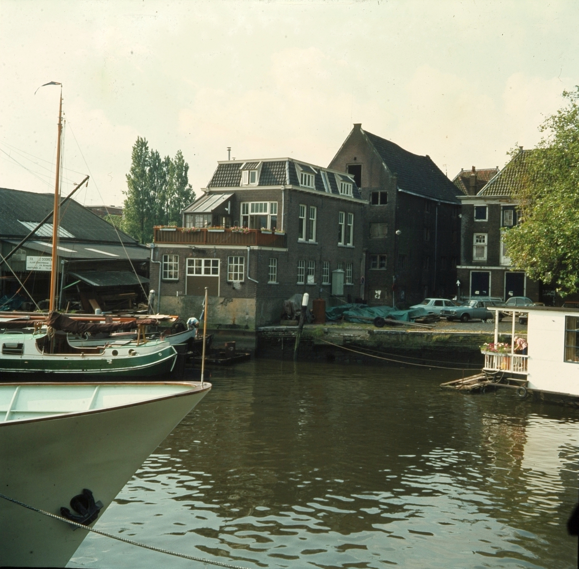 - Gezicht vanaf de Nieuwe Haven op een watergevel aan de Houttuinen, geheel rechts ligt een woonboot; uiterst links scheepstimmerbedrijf van Dooren, op de voorgrond wat pleziervaartuigen.