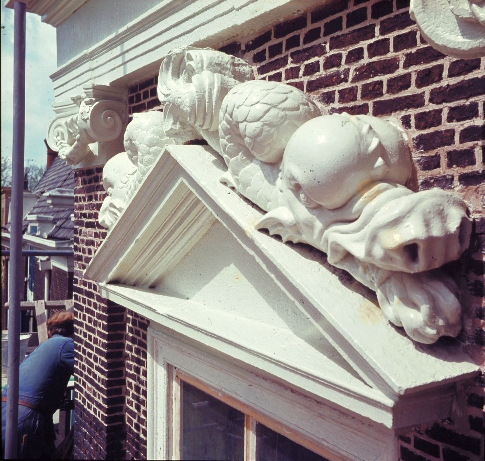 - Detail van de gevelversiering van een pand aan het Grotekerksplein, waarschijnlijk wordt er nog gewerkt aan de gevel.