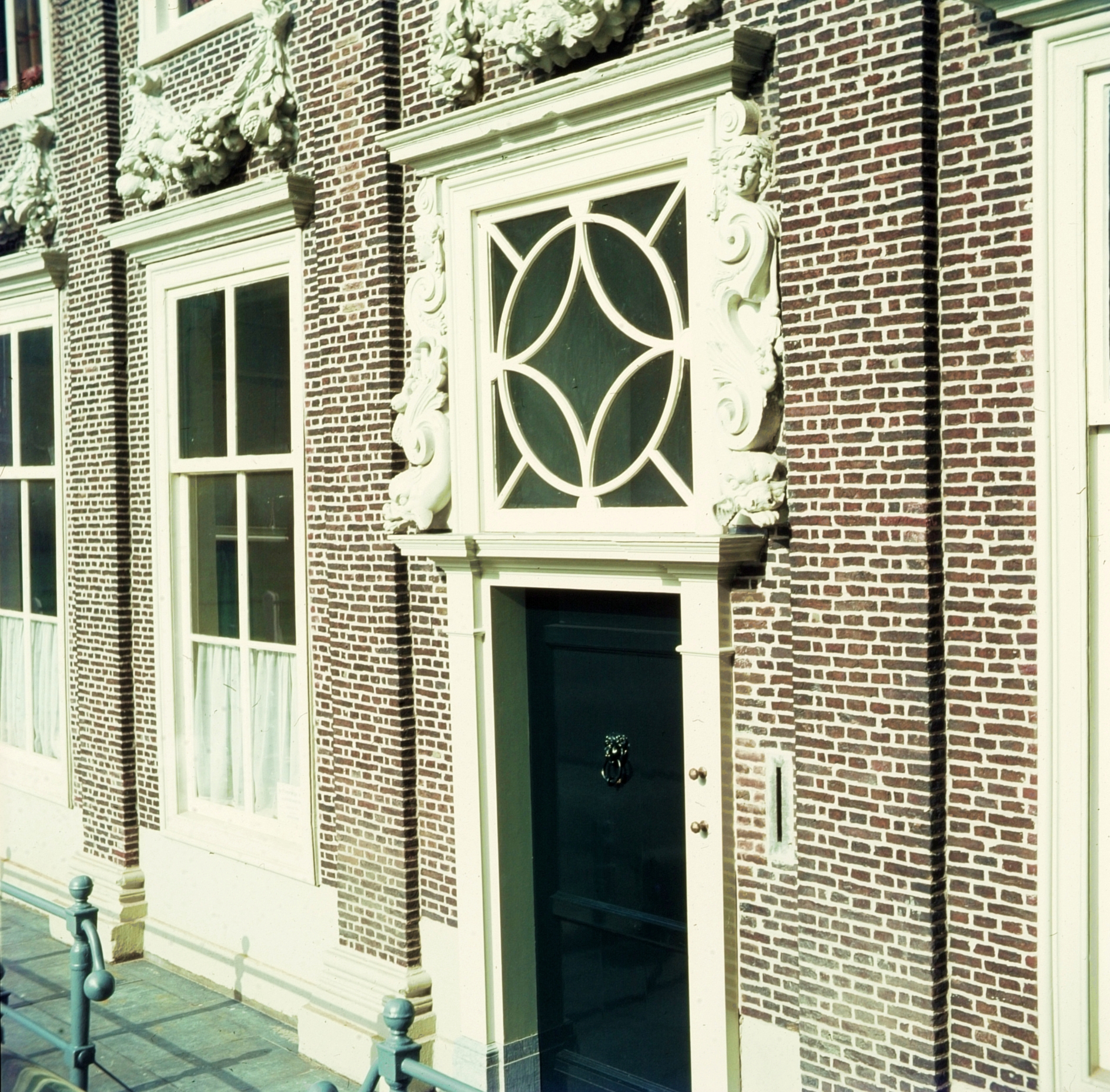 - Voordeur met bovenlicht van een monumentaal pand met gevelversieringen, aan het Grotekerksplein (in dit pand heeft ooit de Dordrechtsche Courant gezeteld).