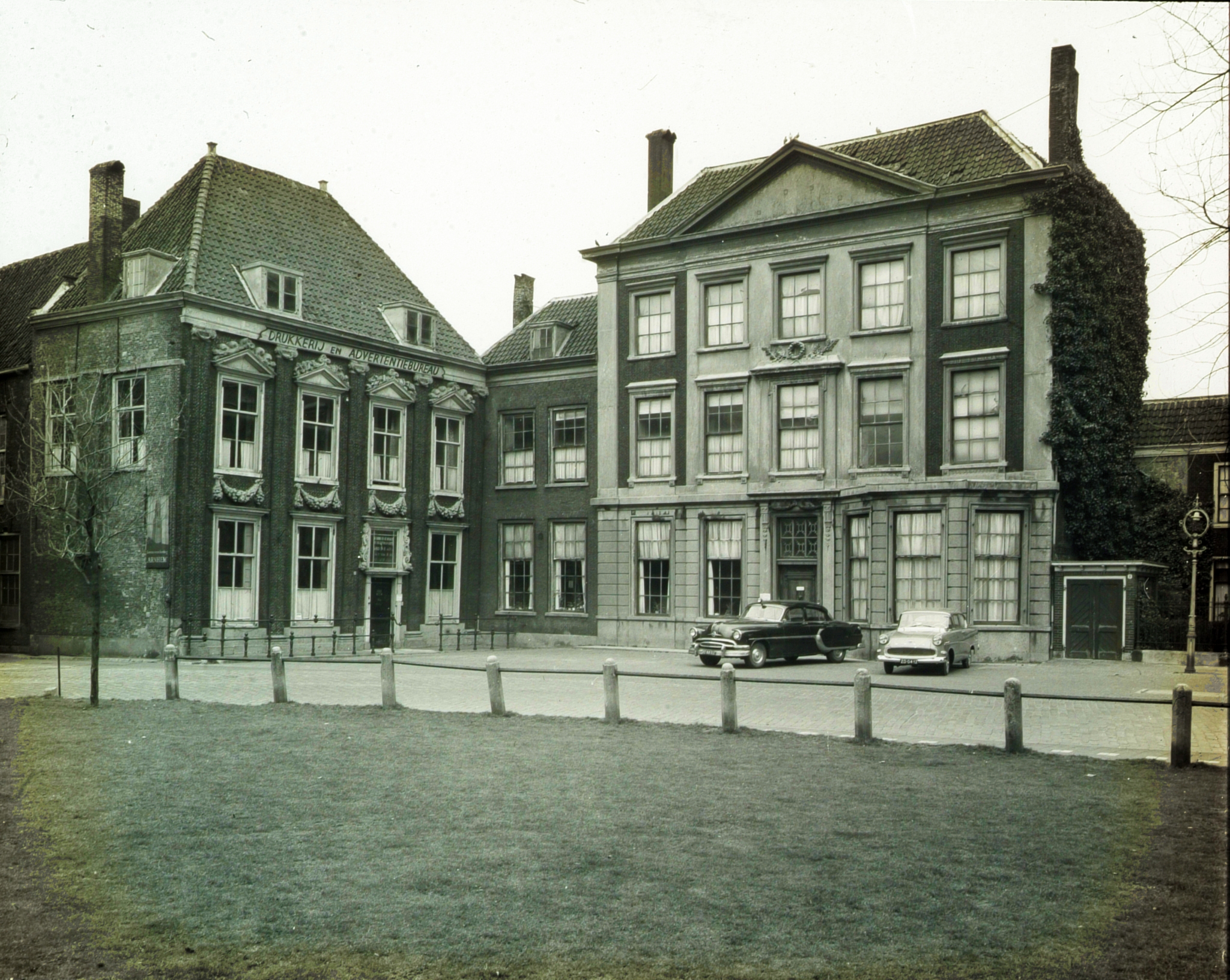 Twee monumentale panden op het Grotekerksplein, gezien vanaf het grasveld bij de Grote Kerk, ten tijde van deze foto was in het pand links een Drukkerij en Advertentiebureau gevestigd; geheel links de Kerkstraat.
