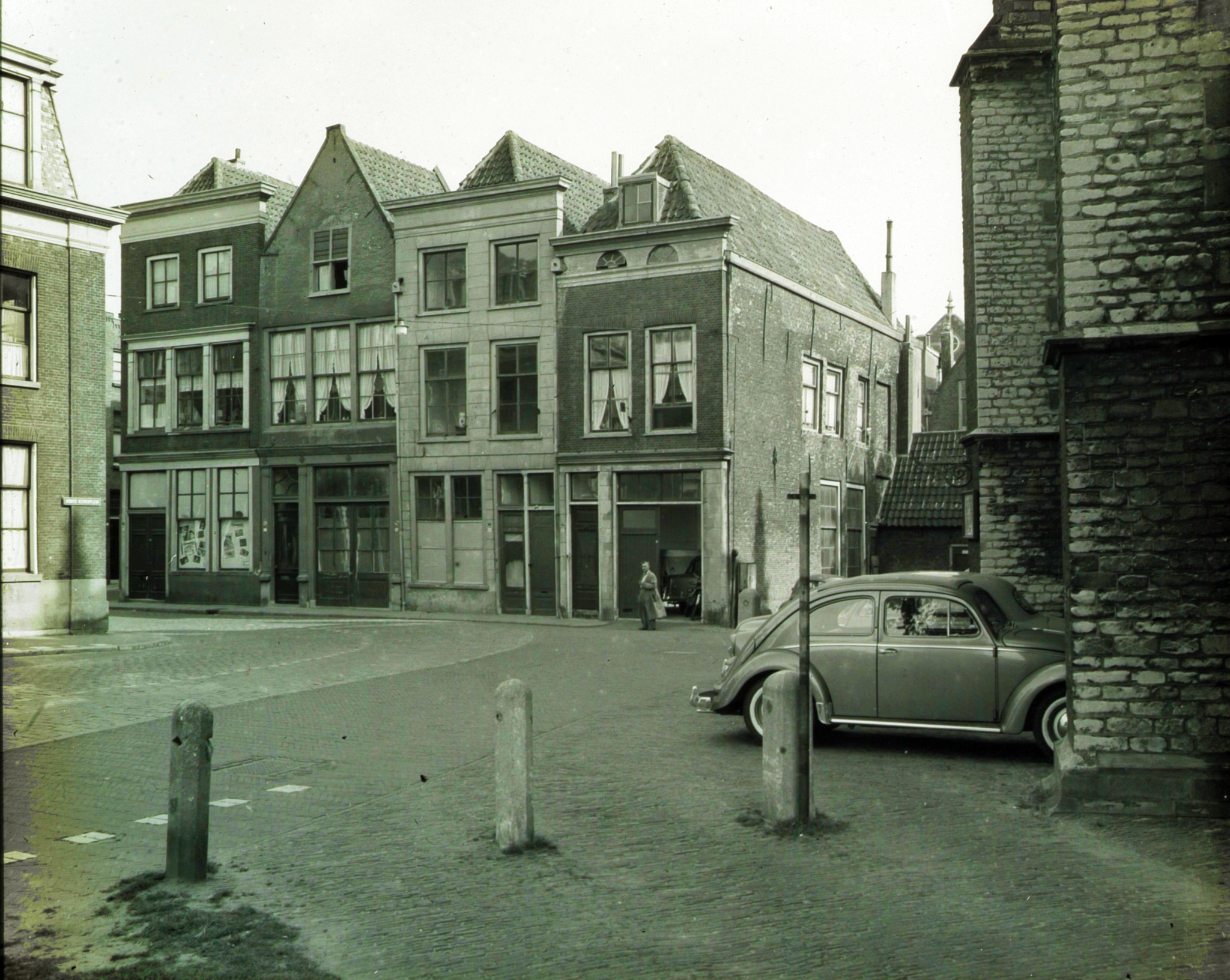 - Grotekerksplein/Grotekerksbuurt, uiterst rechts de Grote Kerk, met de bocht mee naar links de huizen aan de Grotekerksbuurt die later gerestaureerd zullen worden; tussen dit rijtje huizen en de Grote Kerk is het begin van de Pottenkade.