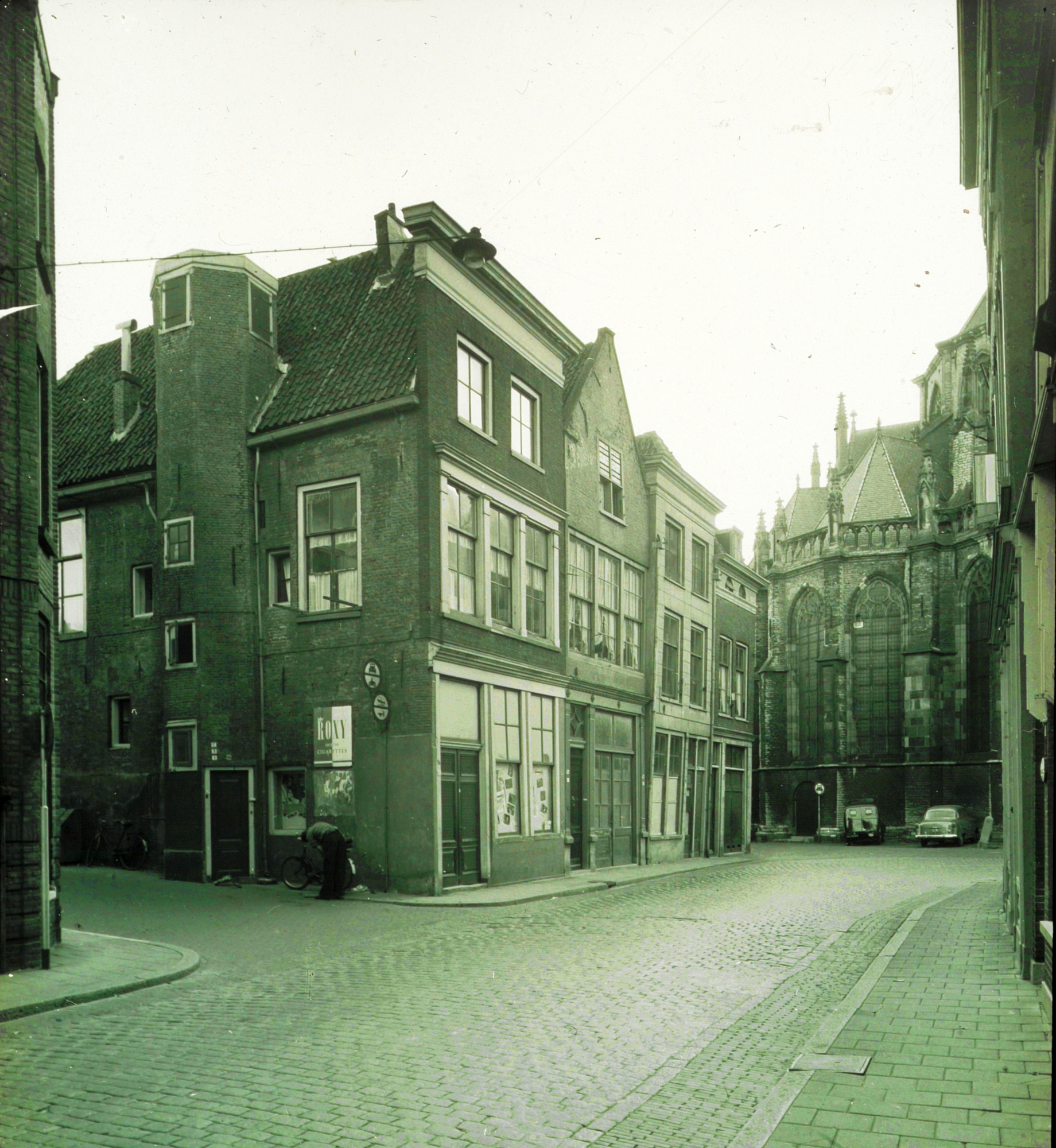 - De Grotekerksbuurt met vooraan links de zijstraat naar de Pelserbrug (richting Voorstraat), tevens links de 4 karakteristieke panden die later zijn gerestaureerd en in het midden centraal een stuk van de Grote Kerk.