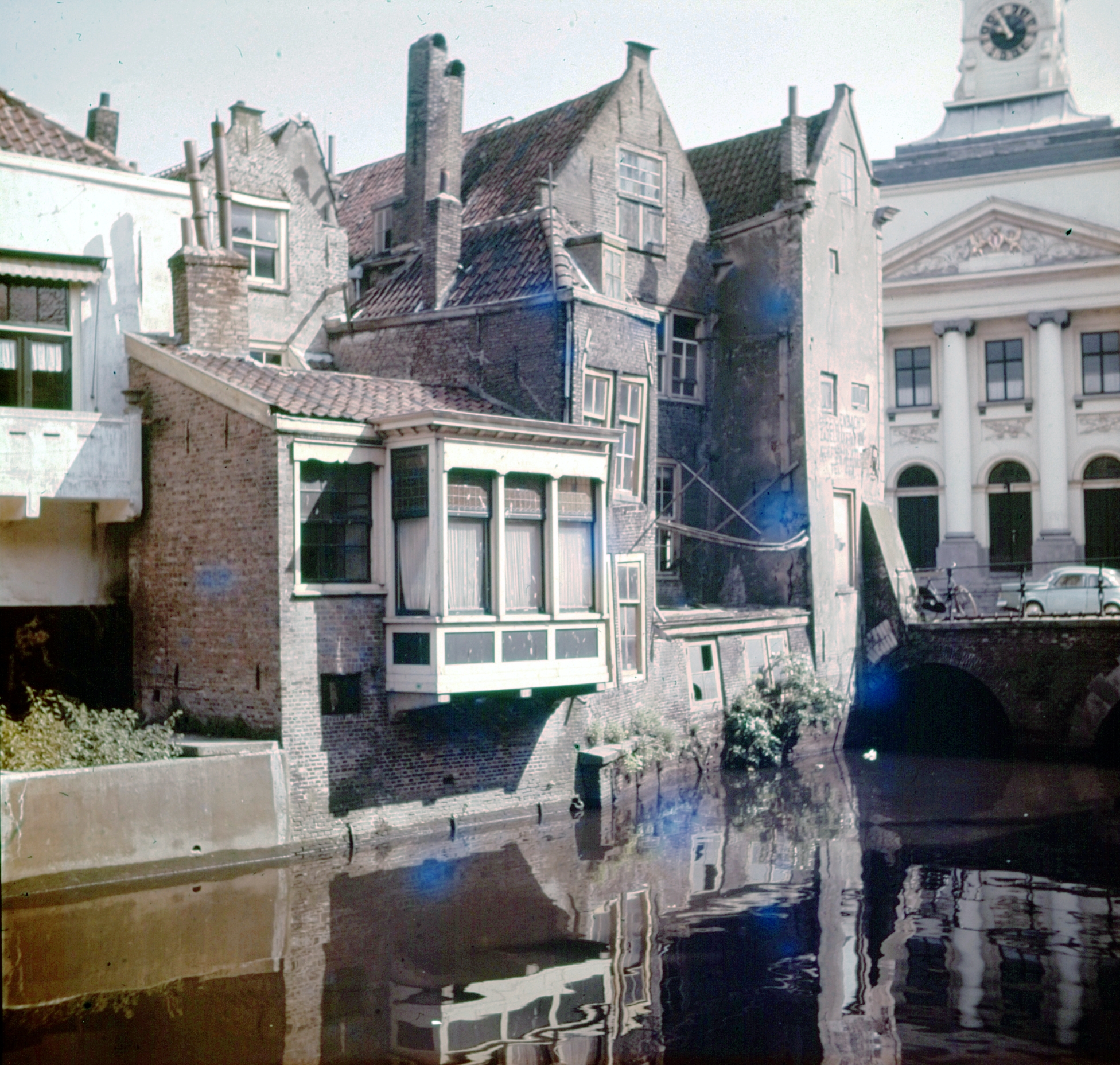 - De Voorstraatshaven met watergevels, de vervallen achterkant van de huizen aan de Grotekerksbuurt; links het stadhuis.